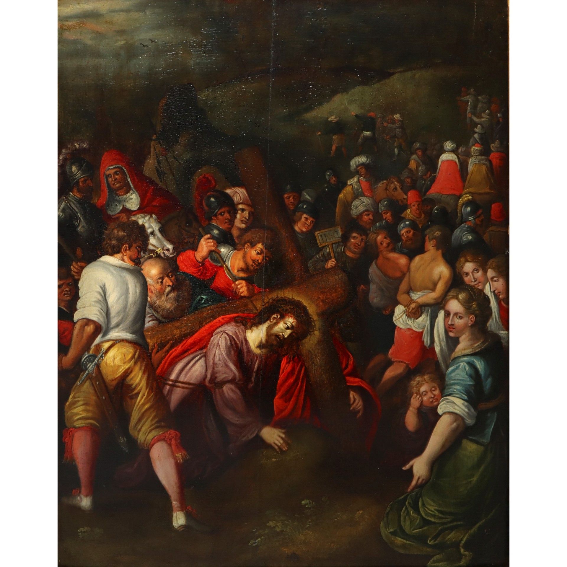 altro maestro fiammingo operoso nel meridione di Italia nella seconda metà del secolo sedicesimo, Simone De Wobreck. Si tratta di un nome che oggi può risultare meno noto rispetto a un de Vos, ma Simone De Wobreck fu un maestro di primissimo spicco, attivo soprattutto in Sicilia dove creò una importante schiera di discepoli e seguaci. Se si confronta il nostro quadro con un autentico capolavoro del De Wobreck come la maestosa pala d' altare della Circoncisione nella chiesa di San Domenico a Castelvetrano risulta a mio avviso lampante come siamo di fronte alla stessa mano. Analitico e pungente, vivacissimo e proliferante, il nostro quadro è stato creato da un artista della stessa mentalità e della stessa cultura figurativa che vediamo espresse nella pala di Castelvetrano. Peraltro Simone De Wobreck trattò ripetutamente il tema della Salita al calvario, come è ben documentato da almeno due pale d'altare che le fonti gli riferiscono, una già in San Francesco a Caccamo e un'altra nella chiesa di santa Maria Maddalena a Ciminna. Il nostro dipinto, insomma, deve essere considerato un rimarchevole lavoro del manierismo fiammingo in Italia, databile probabilmente tra il nono e il decimo decennio del secolo sedicesimo, negli ultimi anni di vita del De Wobreck che, nato ad Haarlem in data imprecisata ma da collocare nel quarto decennio, risulta scomparso, su base documentaria, intorno al 1596/97. Lo stato di conservazione dell'opera in esame mi appare del tutto soddisfacente e stimo, pertanto, il dipinto in base alle condizioni di mercato internazionale ad E.25.000,00 (venticinquemila)