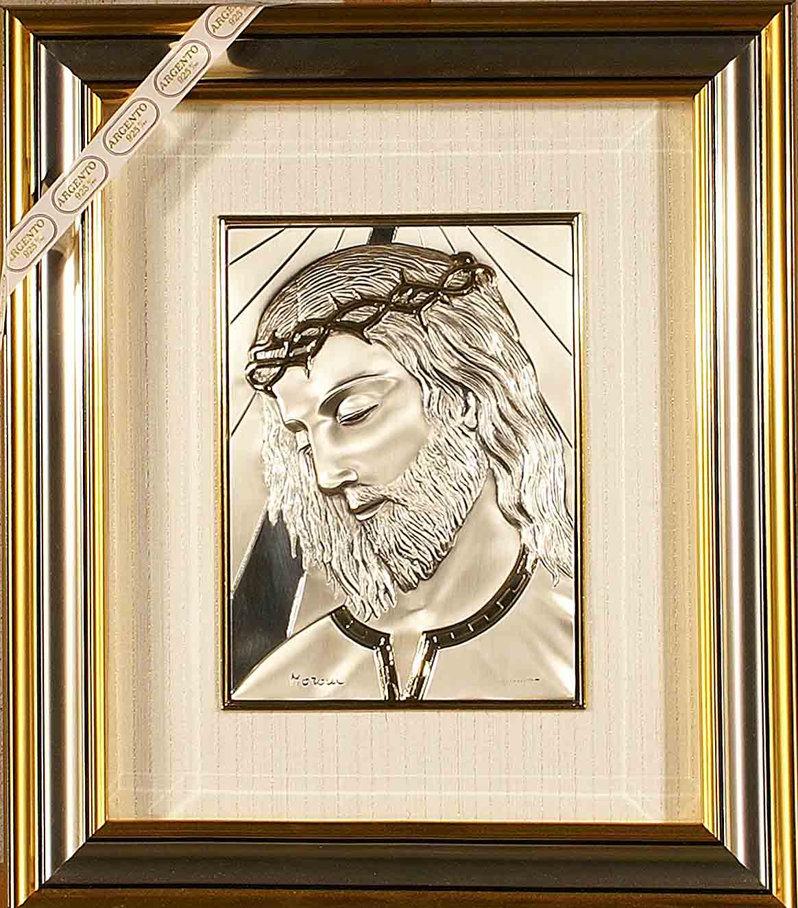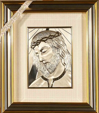 Placca su lastra in argento 925 raffigurante Cristo con corona di spine entro cornice, cm. 24x18.