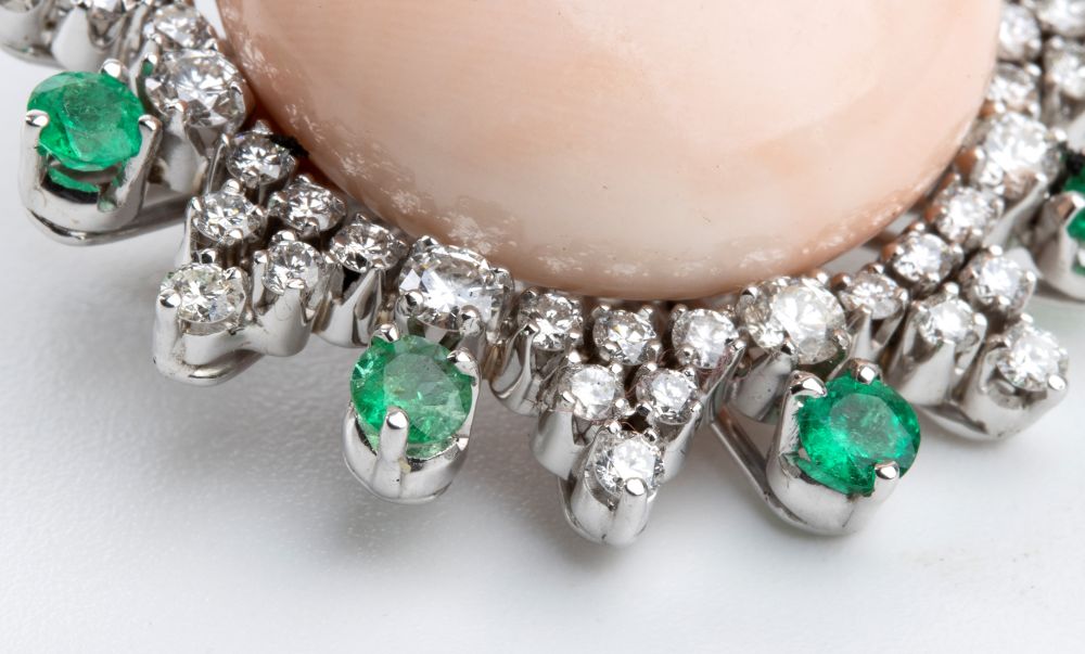 in oro bianco 18k, al centro un cabochon di corallo "pelle d'angelo" (corallium secundum) tra doppia cornice di diamanti e smeraldi.