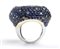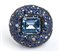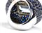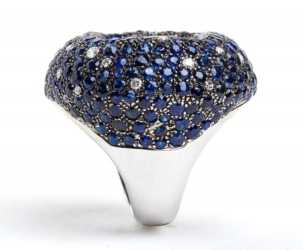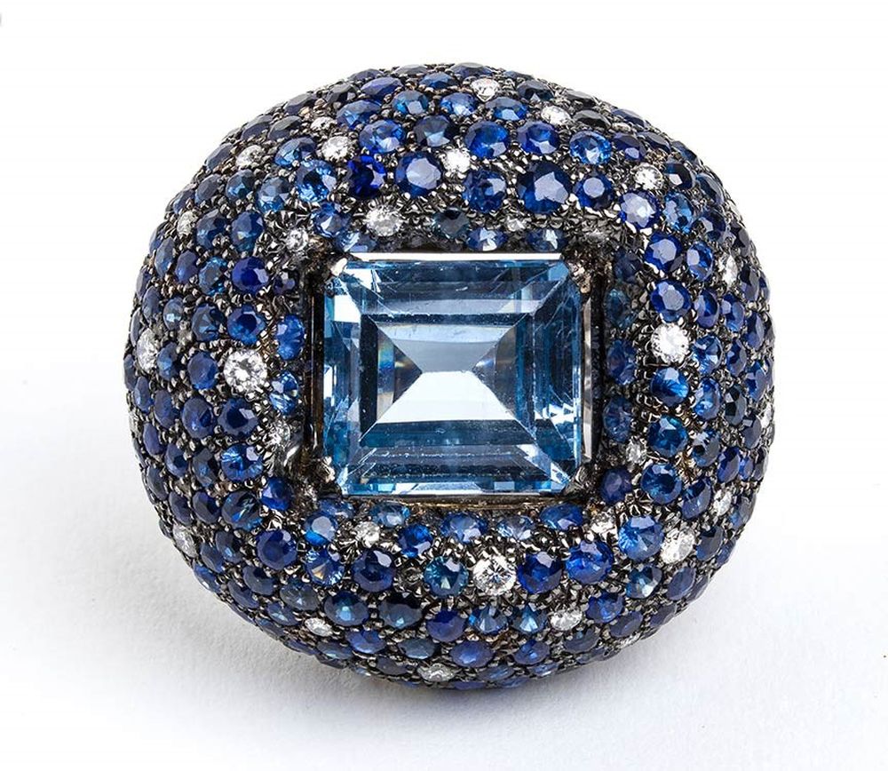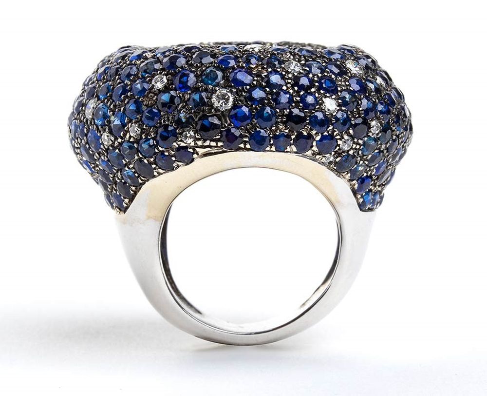 in oro bianco 18k con applicazione di rutenio, incastonato con topazio azzurro contornato da zaffiri e diamanti.