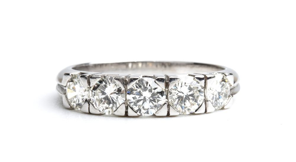 N. 05 diamanti di forma rotonda, taglio brillante, circa 1.15 ct; F-G; VVS-VS.