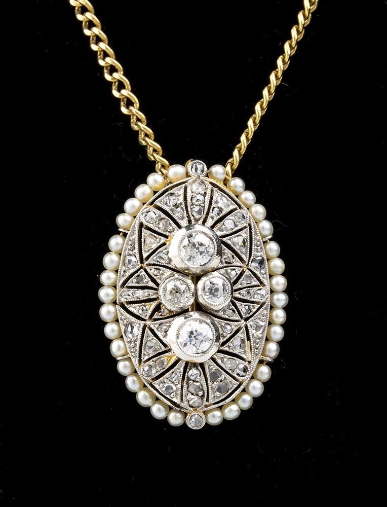 catena in oro giallo a cui è sospeso un pendente-spilla in oro bianco incastonato con diamanti taglio a rosa e taglio old mine, incorniciato da piccole perle coltivate.