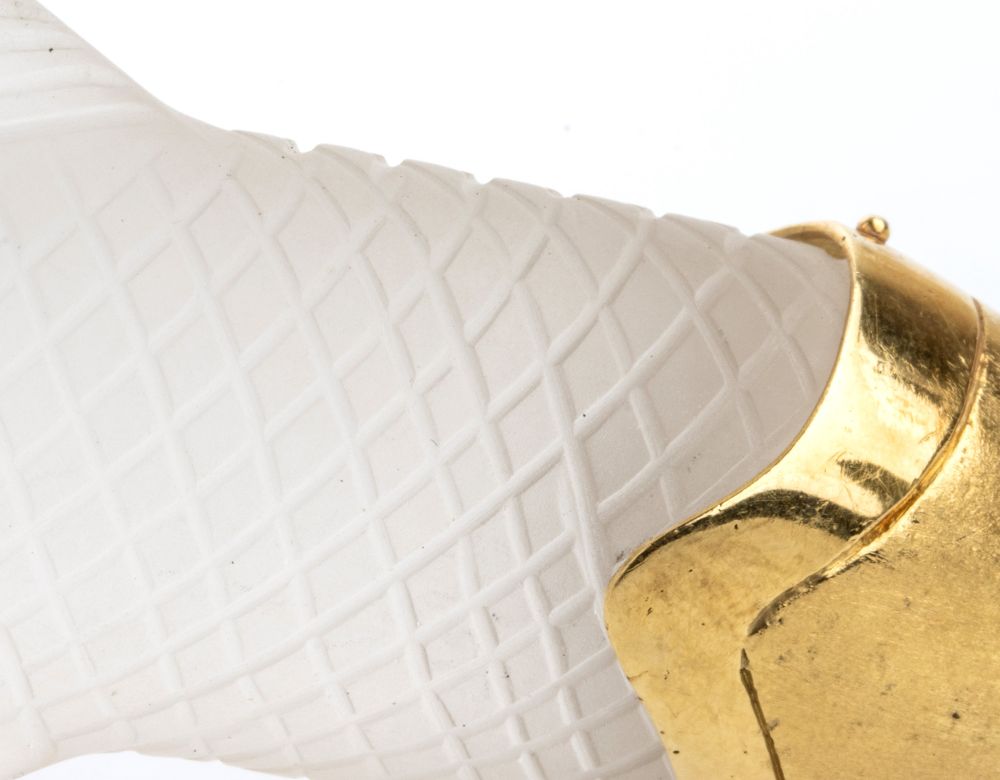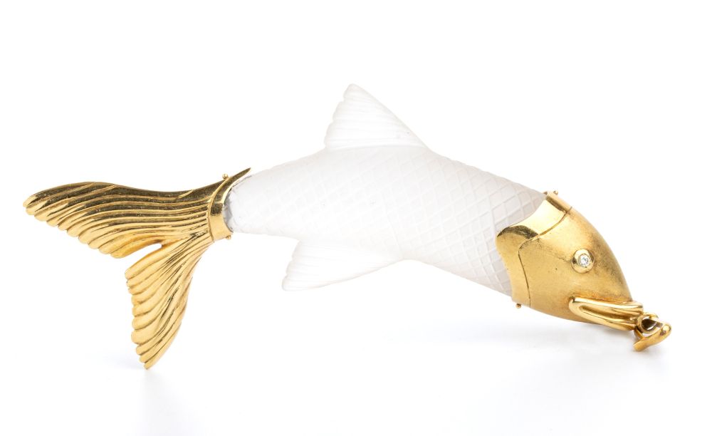 dal corpo scolpito in cristallo di rocca, testa e coda in oro giallo, occhi in piccoli diamanti.