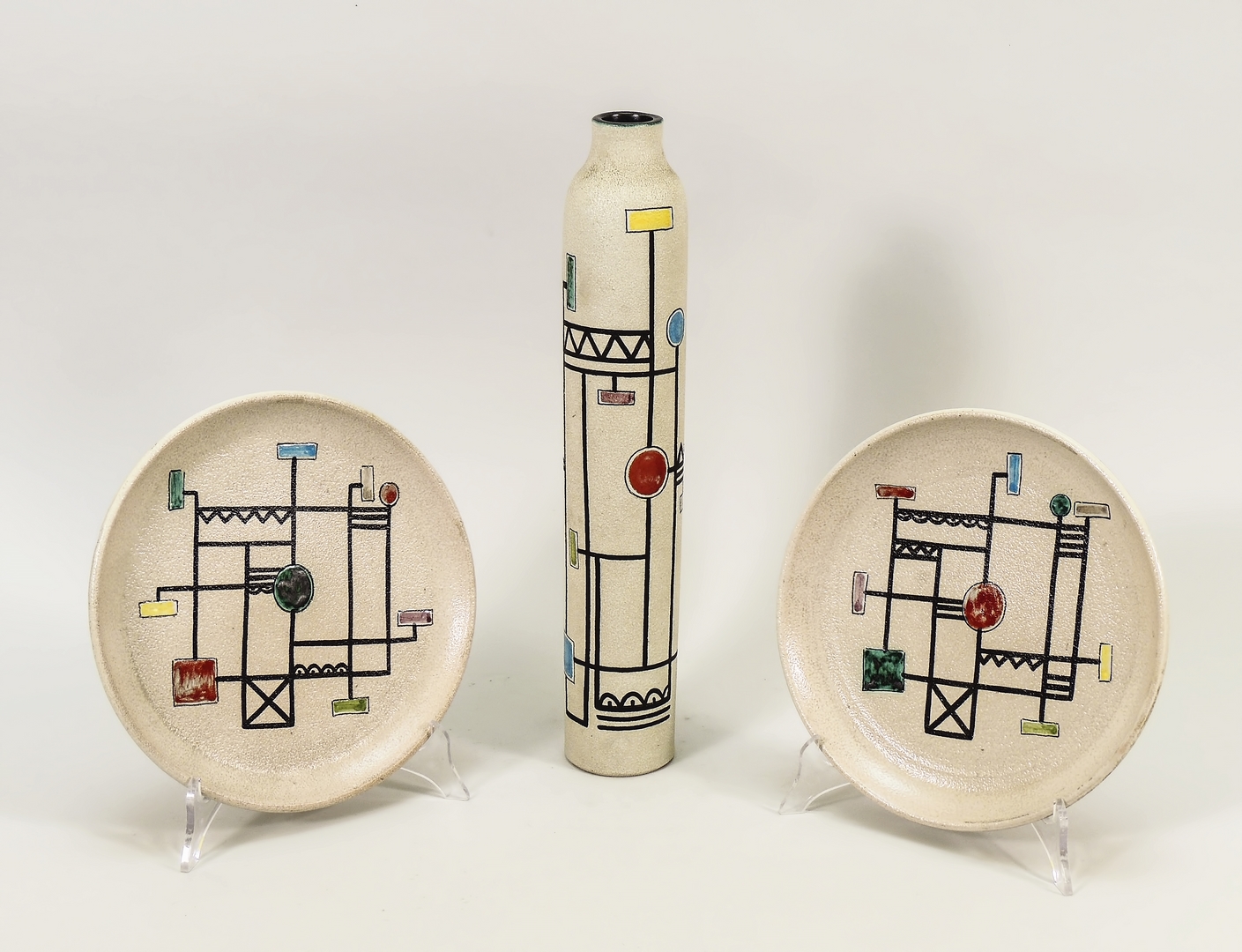 SET IN CERAMICA - CERAMIC SET Ceas, Albisola, Anni Cinquanta - Ceas, Albisola, 50s composto da coppia di piatti e vaso cilindrico dipiti a smalto con motivi astratti (3) diam cm 24, h cm 41