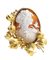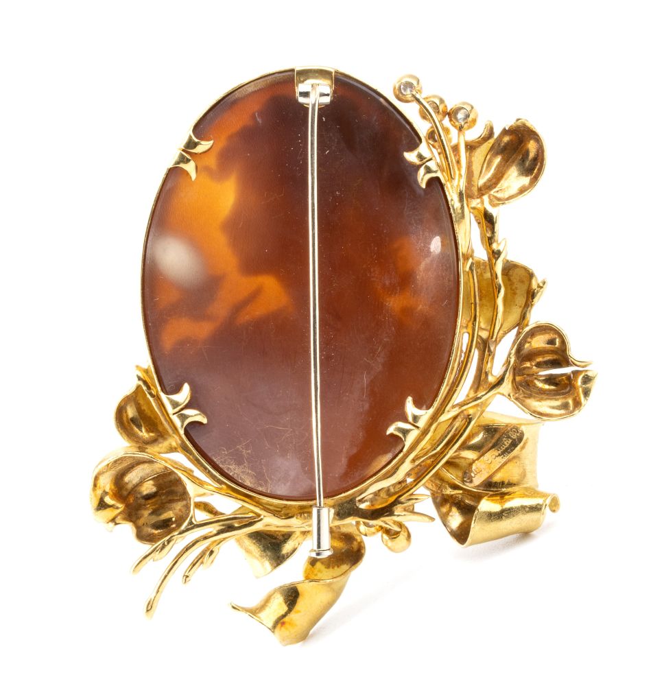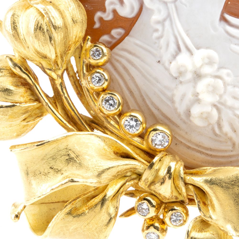 in oro giallo 18k, incastonata con cammeo in conchiglia sardonica, raffigurante il profilo di una donna contornata da un motivo a fiocco con steli punteggiati da diamanti.