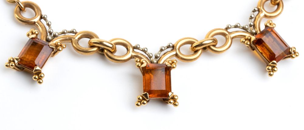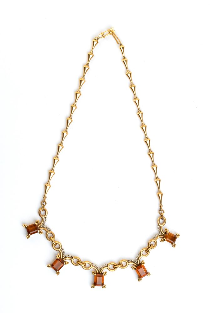 sezione centrale con catena in maglie ad anelli, dettagli in piccole sfere e frangia di quarzi citrini.