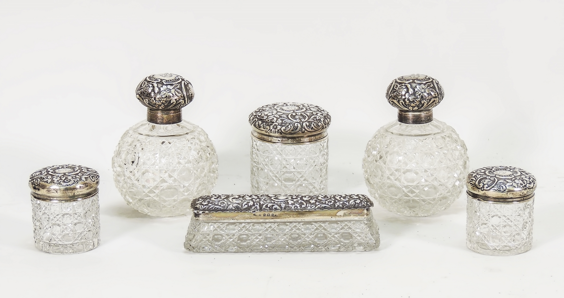 SERVITO DA TOILETTE IN ARGENTO E CRISTALLO - SILVER AND CRYSTAL TOILETTE SET Birmingham, 1900-1902 composto da due flaconi e quattro scatole di diverse dimensioni con coperchi sbalzati con fiori e girali, lievi difetti (6)