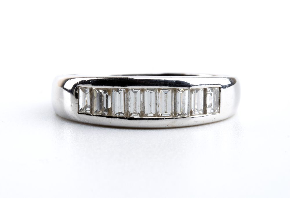 N. 09 diamanti di forma rettangolare, taglio a gradini, circa 1.10 ct; G-H; VVS.