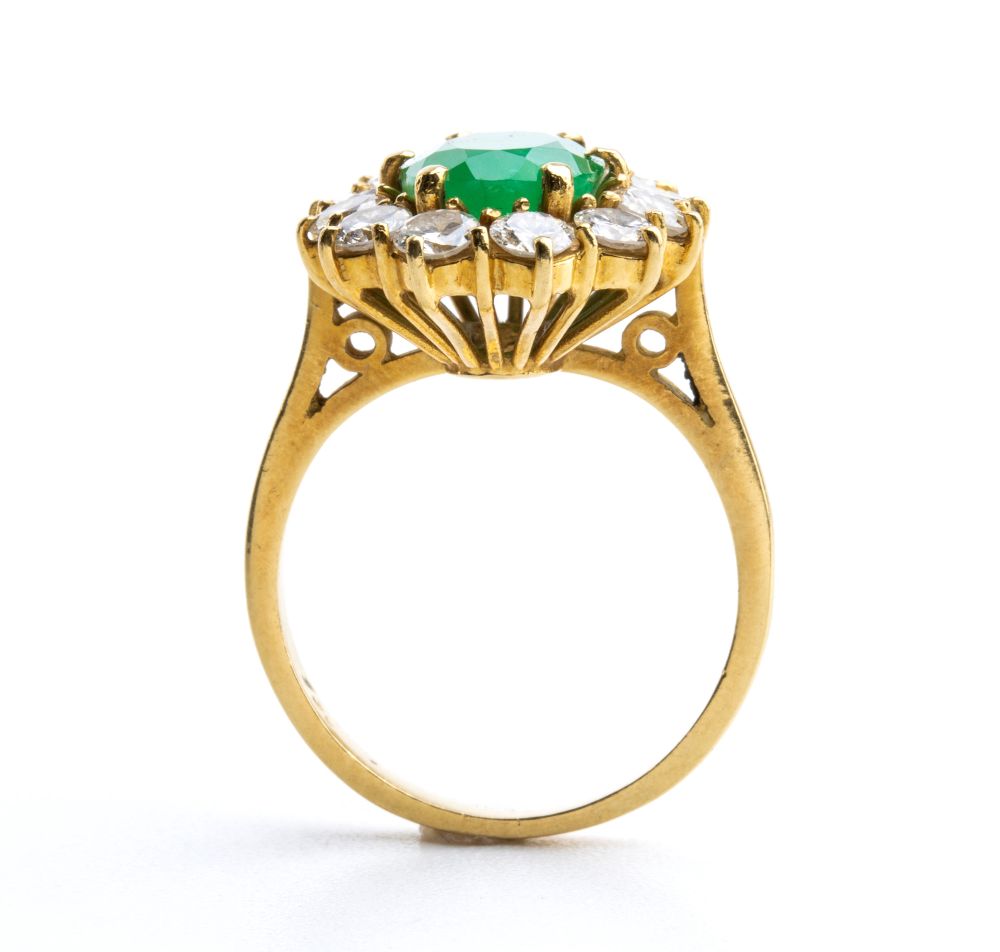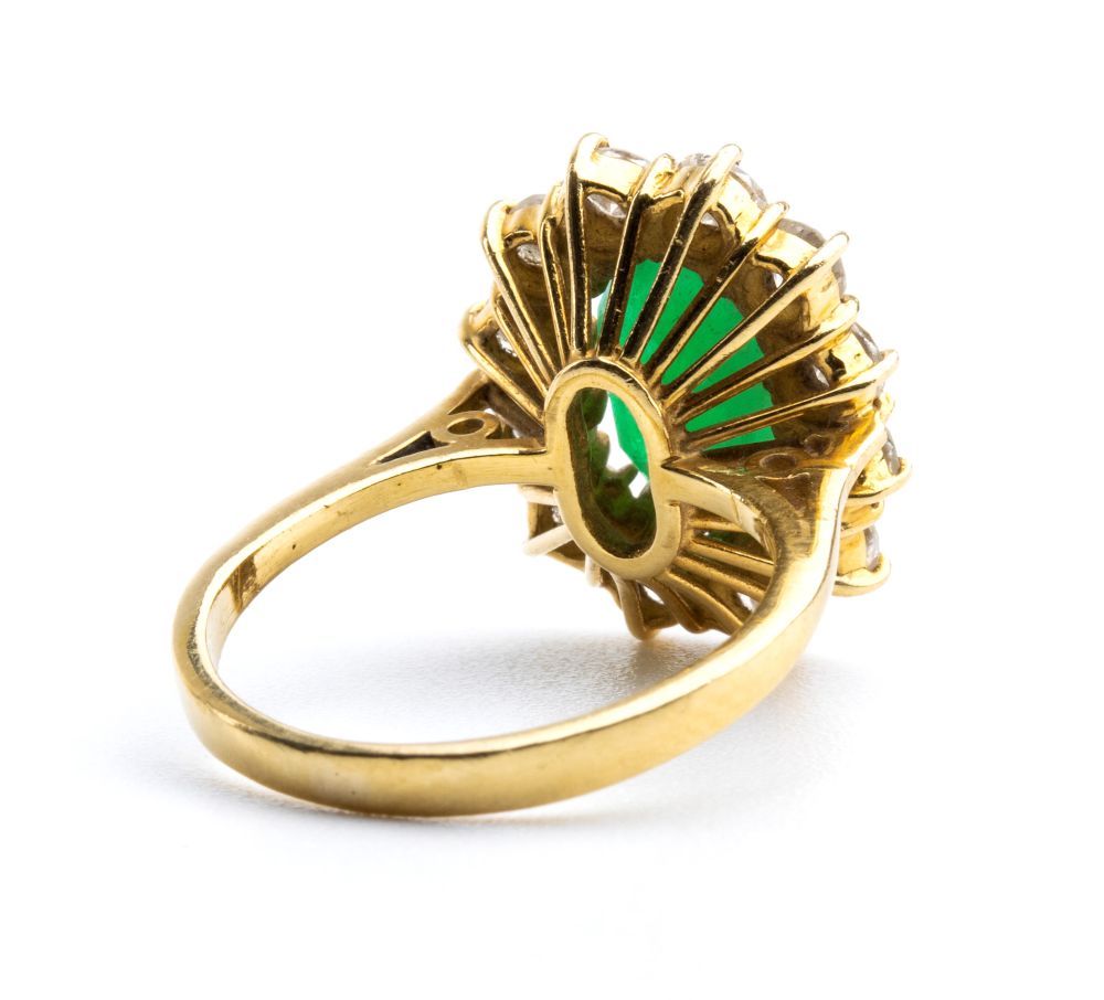 montatura a fiore in oro giallo 18k con smeraldo incorniciato da diamanti.