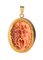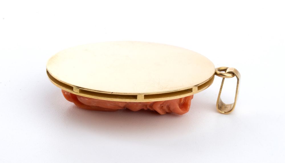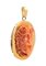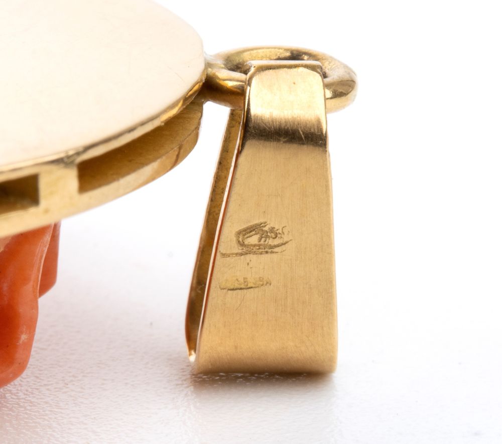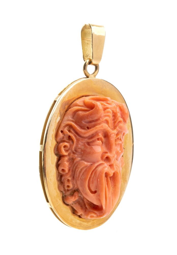 in oro giallo 18k, corallo cerasuolo intagliato (corallium elatius), raffigurante una maschera o il volto di un satiro.