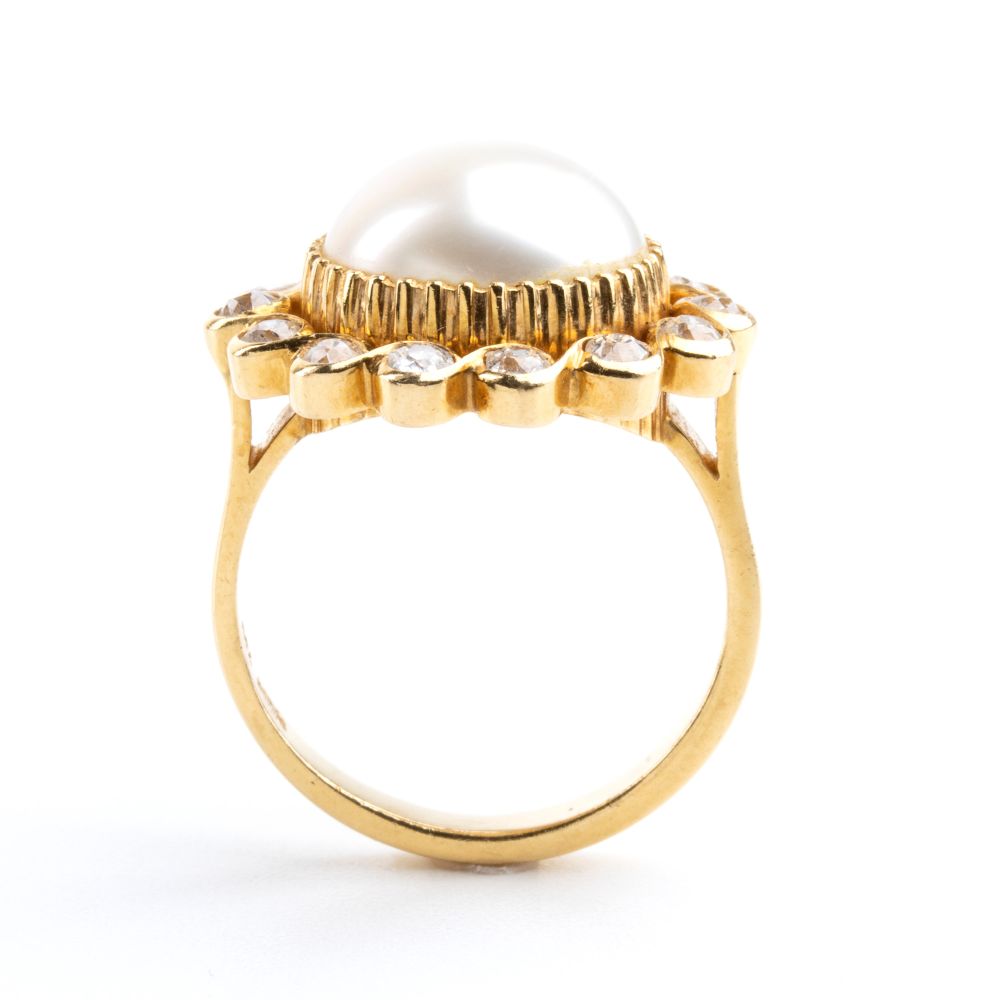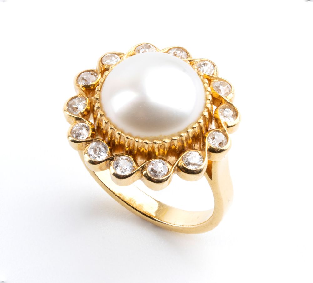 in oro bianco 18k, motivo a fiore con perla mabe' contornata da diamanti.