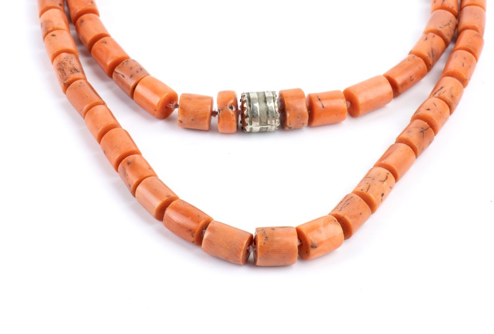 a due fili di barilotti di corallo Mediterraneo (corallium rubrum) disposti in gradazione, fermezza in oro giallo.
