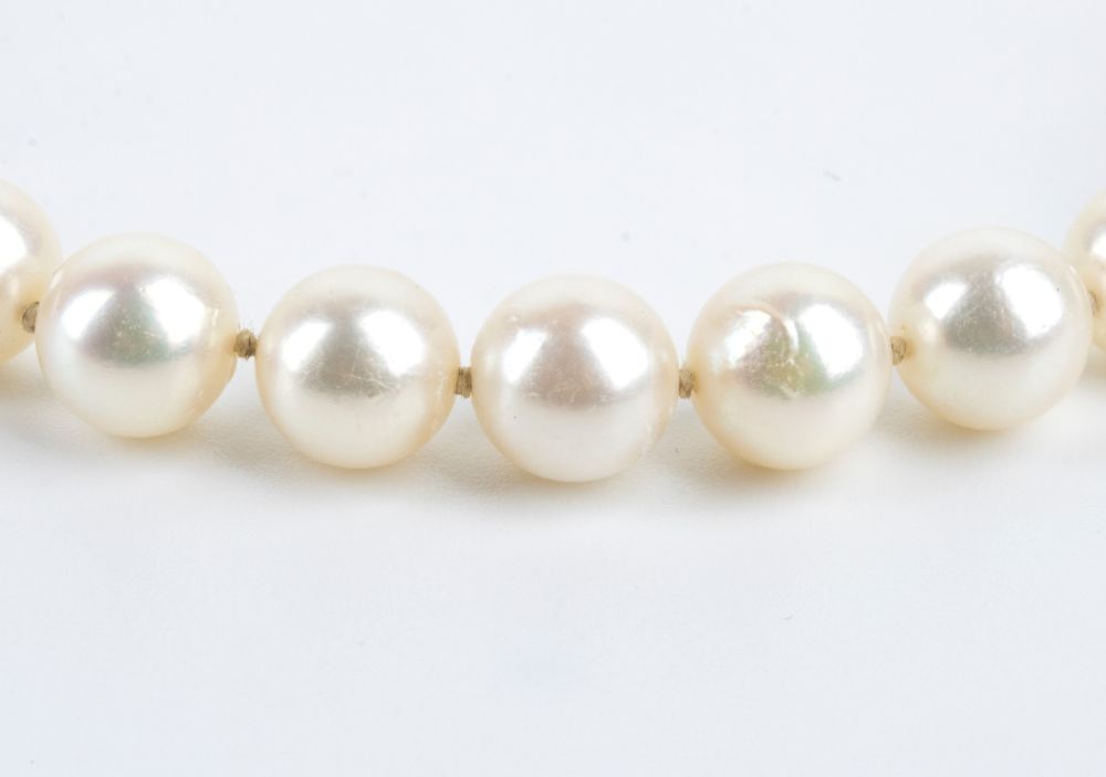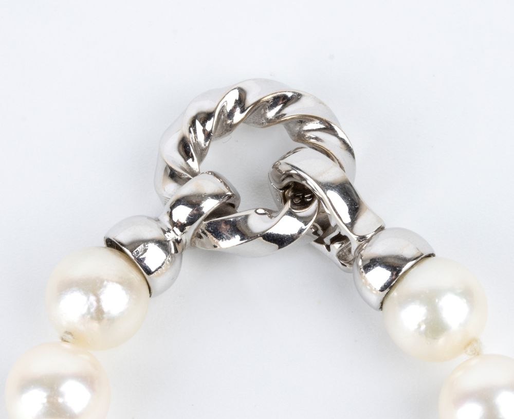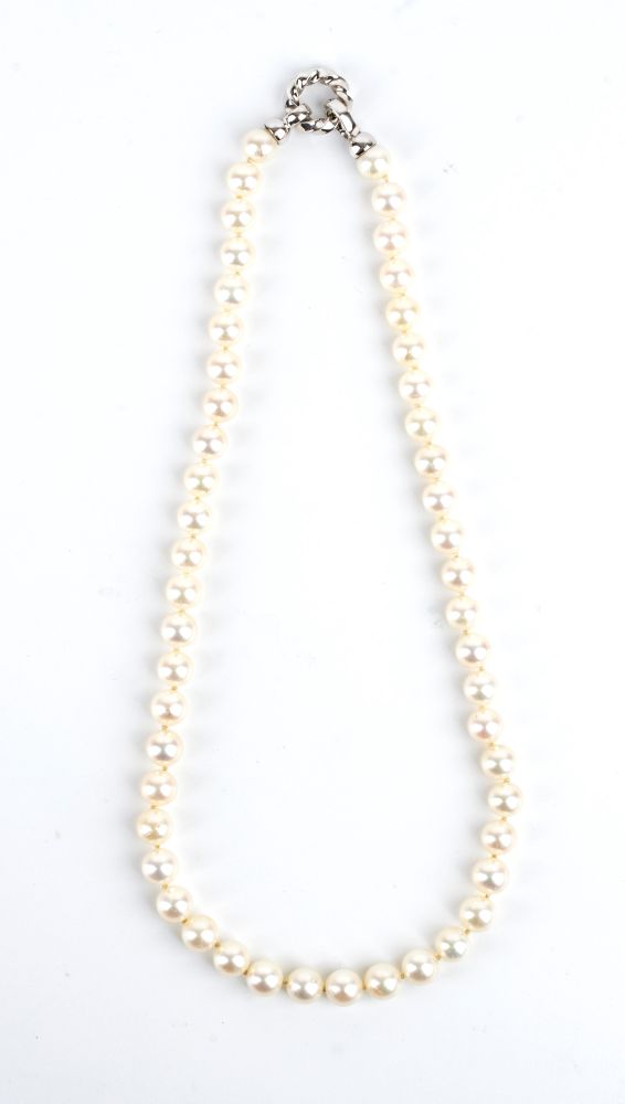 ad un filo di perle coltivate d'acqua salata con chiusura a moschettone in oro bianco 18k.