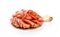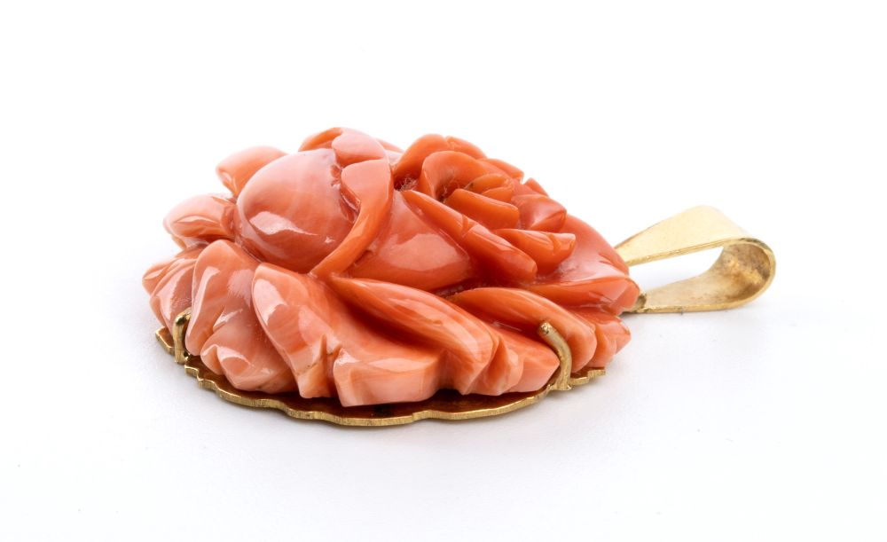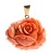 in oro giallo 18k, con corallo cerasuolo scolpito (corallium elatius), raffigurante un bocciolo di rosa.