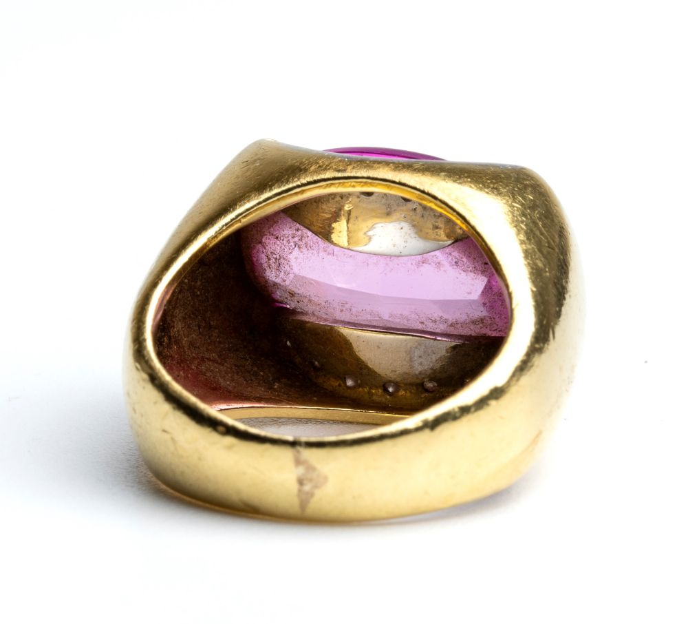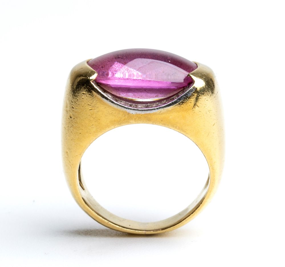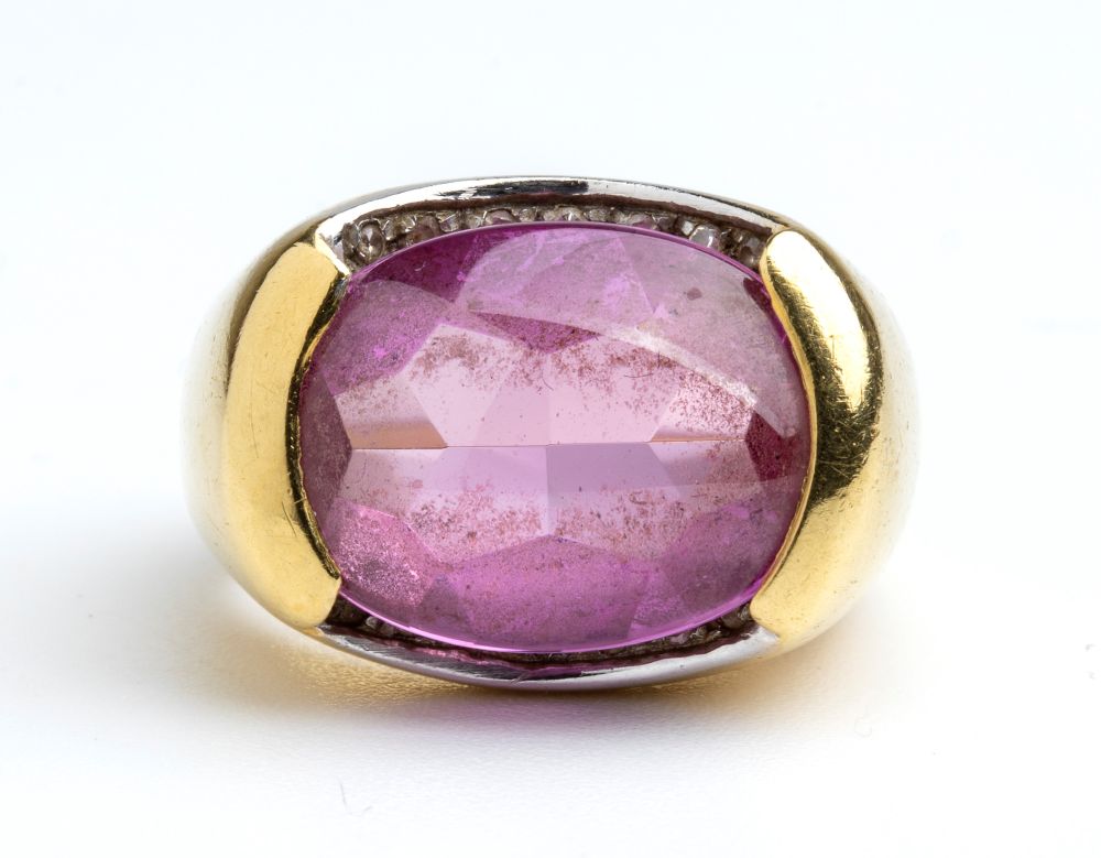 in oro giallo 18k, incastonato con pasta vitrea affiancata da diamanti.