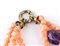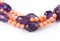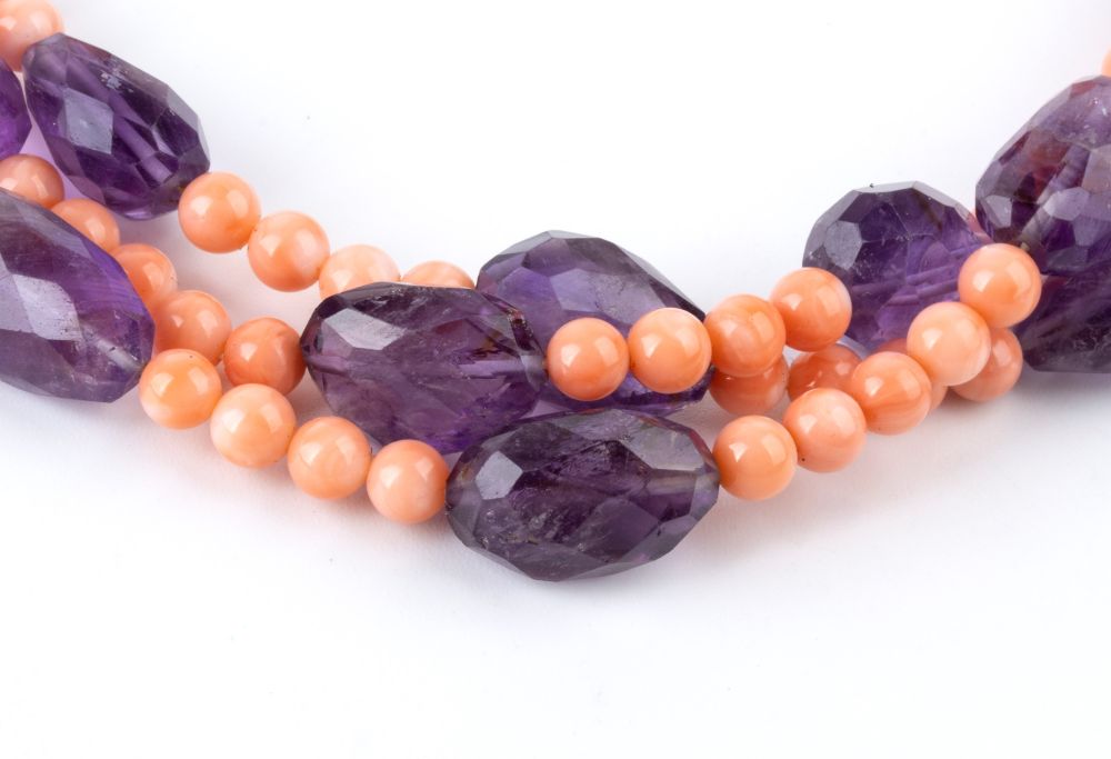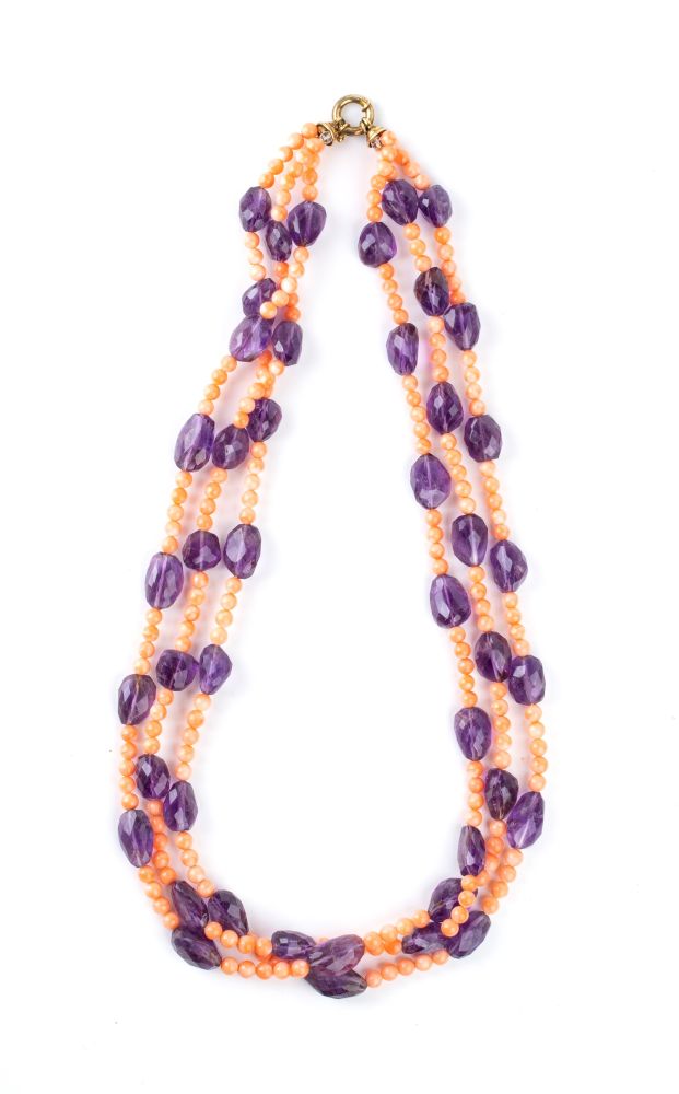 a tre fili di piccole sfere di corallo cerasuolo (corallium elatius) interrotti da ametiste, chiusura a moschettone in argento.