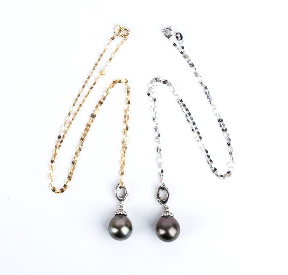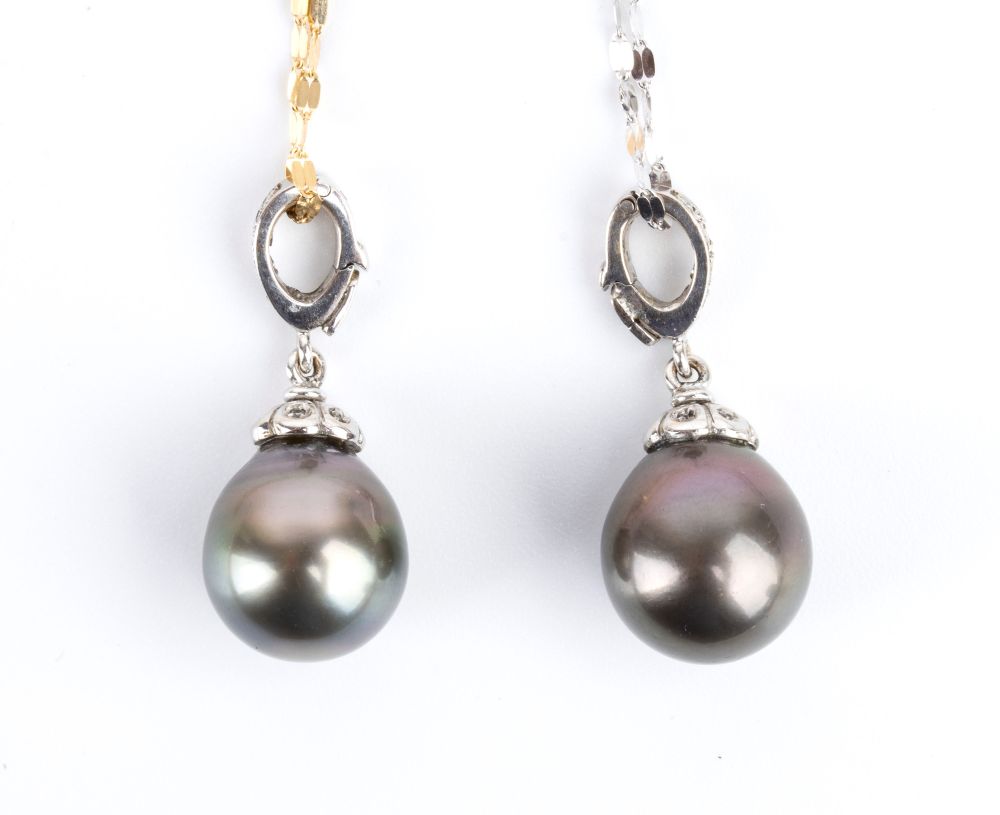 in oro giallo ed oro bianco, ciascuno con perla Tahiti pendente, sormontata da diamante.
