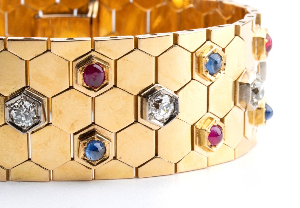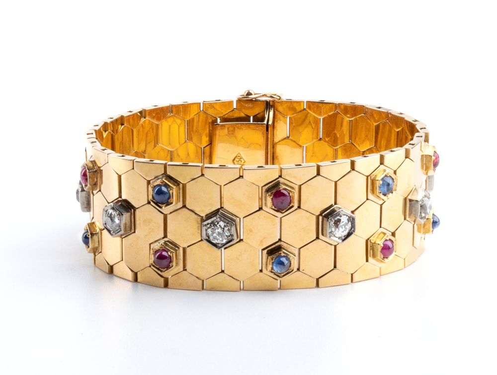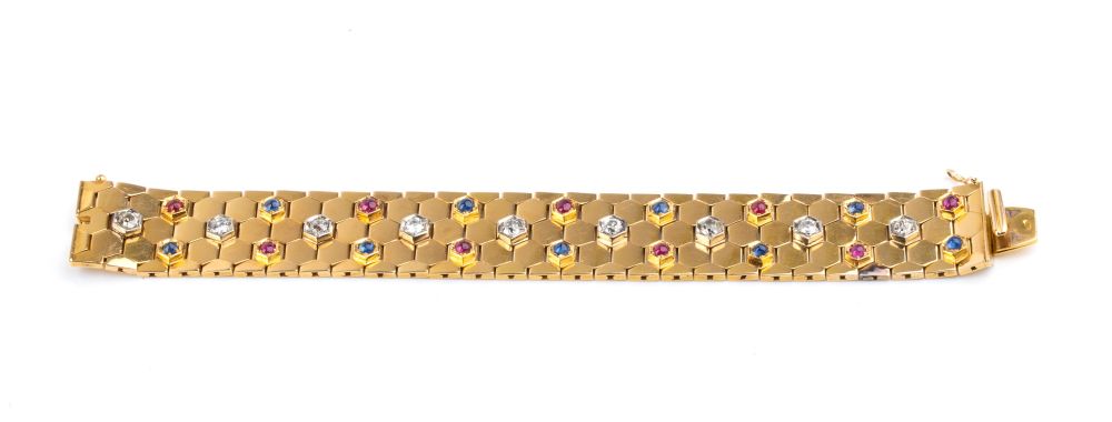 Bracciale alveare in oro con diamanti, zaffiri e rubini - anni '50