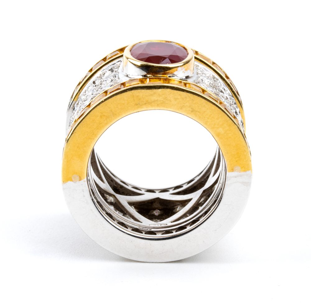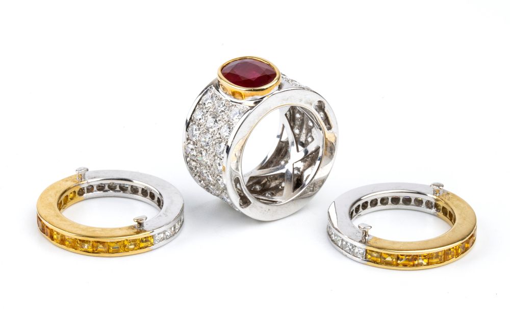 in oro bianco e oro giallo 18k, montatura composta da tre fasce scomponibili. La centrale è in oro bianco, incastonata con rubino affiancato da pavé di diamanti; le due fasce laterali sono più sottili e realizzate in due colori di oro, incastonate con linee di diamanti e corindoni gialli.