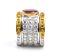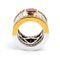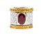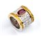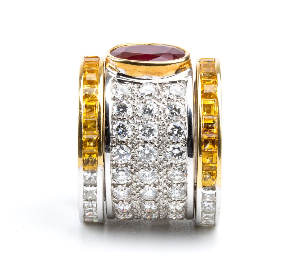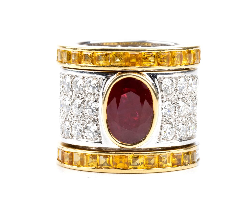 Anello in oro a tre fasce con rubino centrale, zaffiri gialli e diamanti