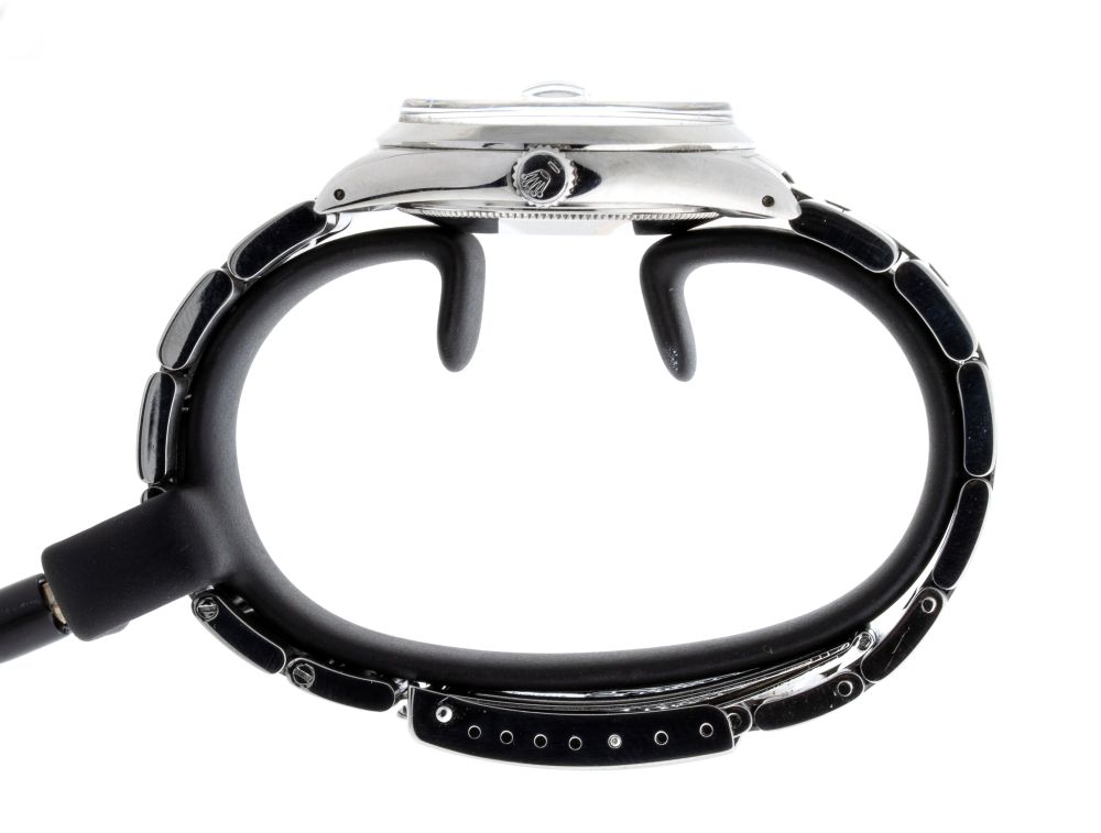 cassa e bracciale Oyster 78350 in acciaio, quadrante bianco con numeri romani e indici e sfere argentati, datario alle ore 3 e vetro plastica, movimento meccanico a carica automatica calibro 1570 matricola 6.745.574 risalente al 1981.