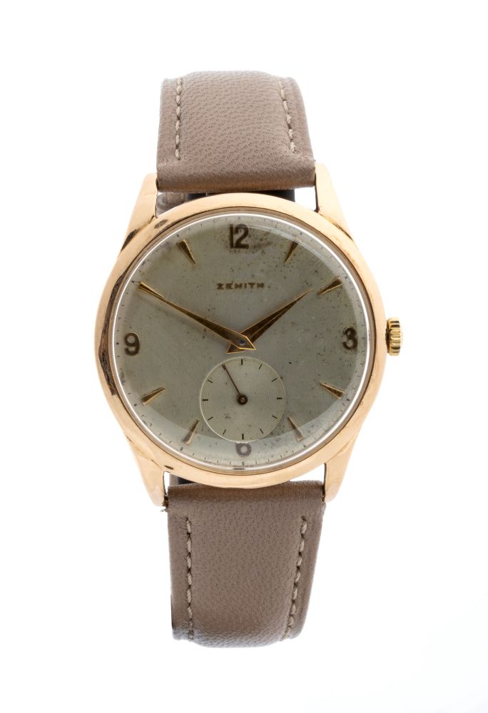 cassa anonima in oro 18k, quadrante bianco con indici e sfere a gladio dorate e numeri arabi, secondi alle ore 6; movimento Zenith calibro 126 matricola 4323884.