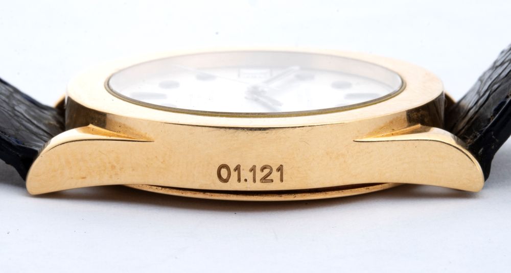 cassa in oro giallo 18K, quadrante bianco con indici sferici, movimento meccanico a carica automatica base ETA 2892. Sul fondello Chronometer No 115 e numero seriale 411503G.