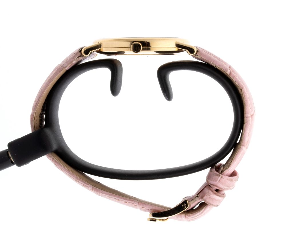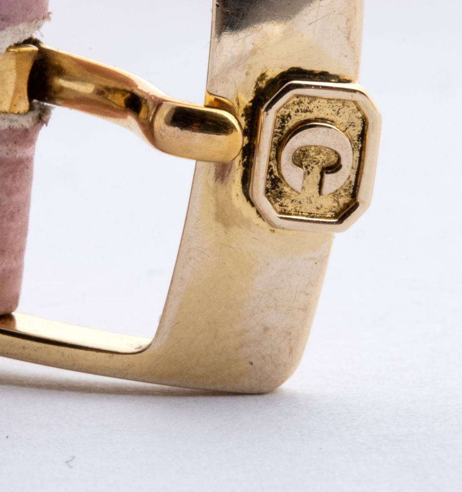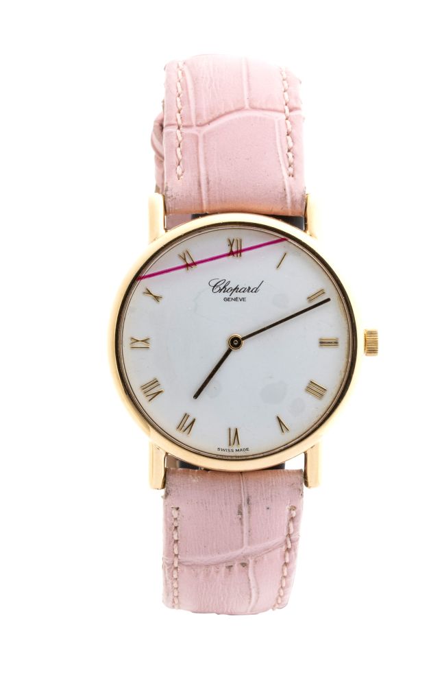 Cinturino in pelle rosa con fibbia Chopard placcata in oro.