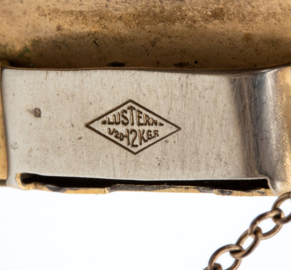 in metallo laminato in oro 12K con orologio integrato, quadrante dorato con inserto bianco e numeri arabi dorati. Movimento meccanico a carica manuale. Incisione laterale "MARYMOUNT".