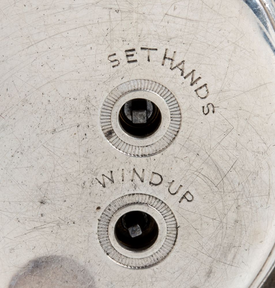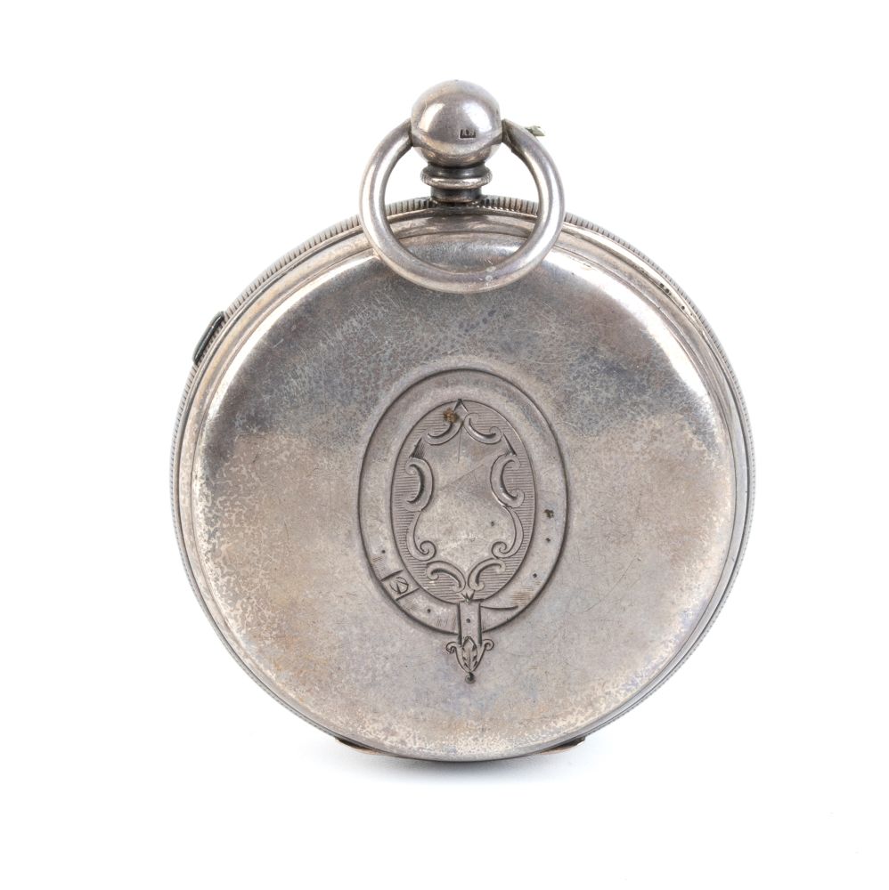 cassa in argento 925/1000 punzonata Chester 1878-79, quadrante in smalto bianco con numeri romani, cursore laterale per attivare e fermare il movimento. Rimessa dell’ora e carica a chiave.