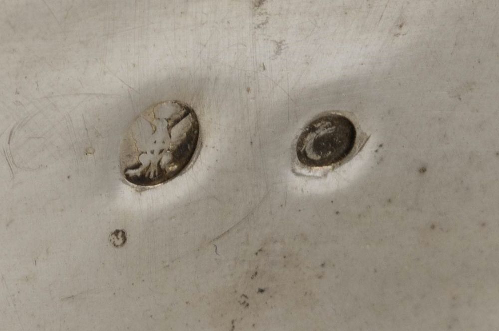 di forma ovale con bordo traforato, poggiante su quattro piedini; presa centrale con due ampolle laterali in vetro. Argento 800/1000, punzonata con i marchi in uso a Genova, Regno di Sardegna dal 1824 al 1872.