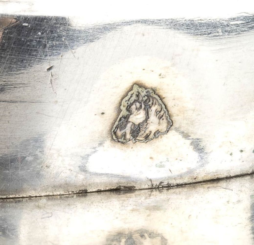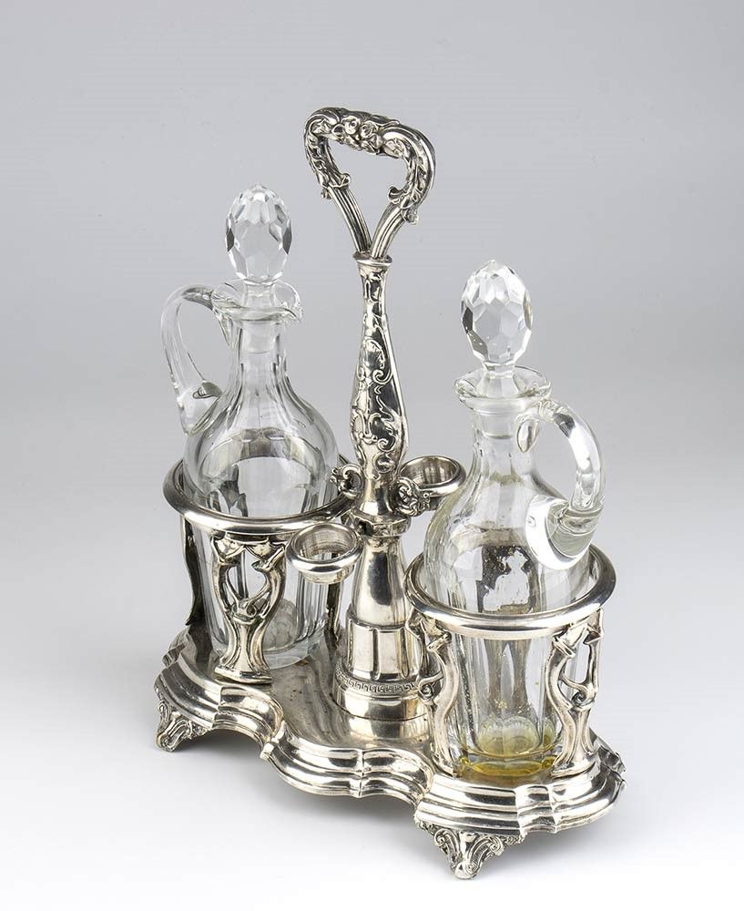 di forma sagomata, poggiante su quattro piedini fogliati; presa centrale con due ampolle laterali in vetro. Argento 800/1000, punzonata con i marchi in uso a Novara, Regno di Sardegna dal 1824 al 1872 e con il marchio dell'argentiere Canetti Ferdinando operante a Vercelli a partire dal 1824.