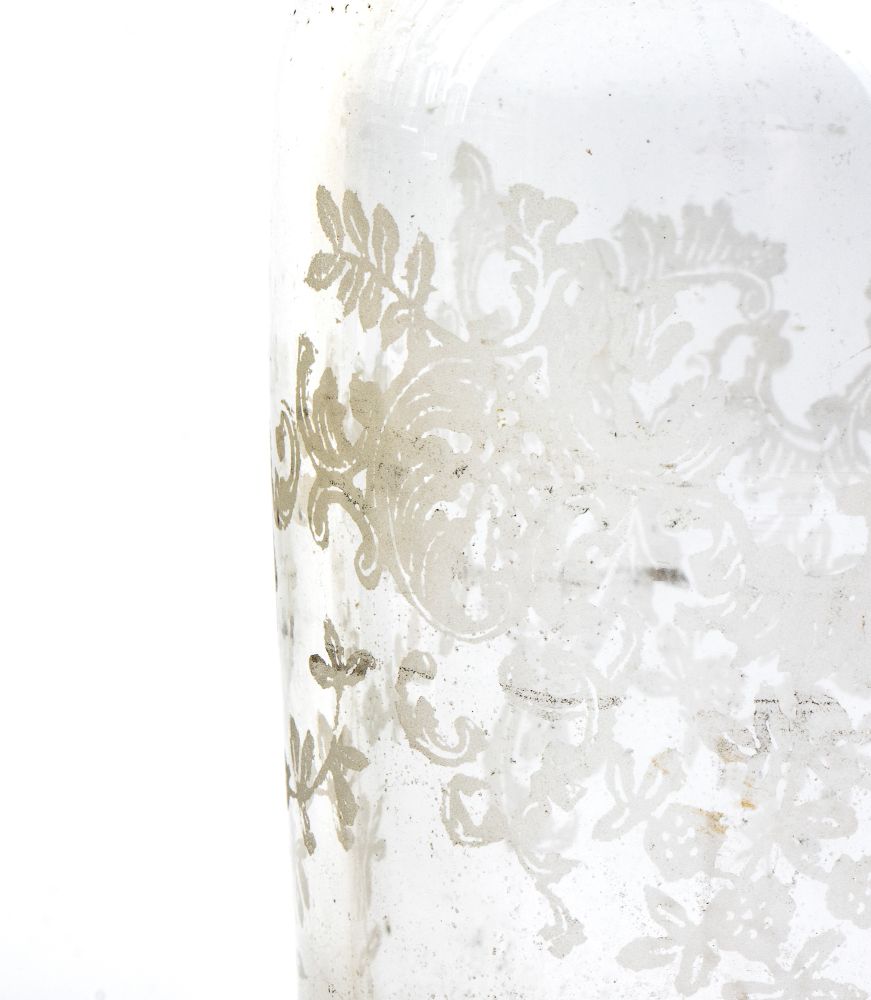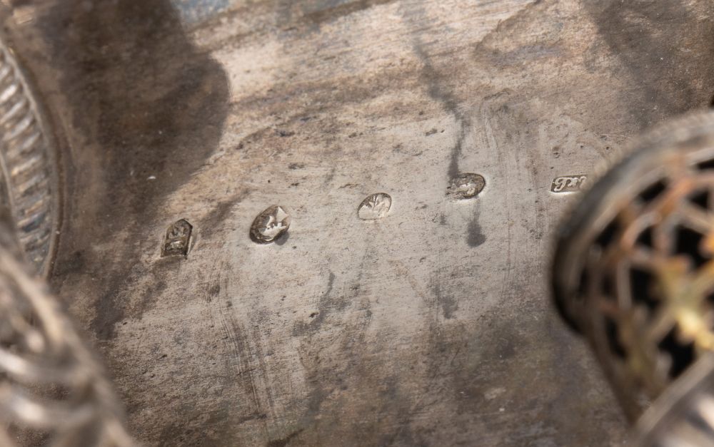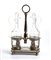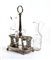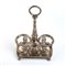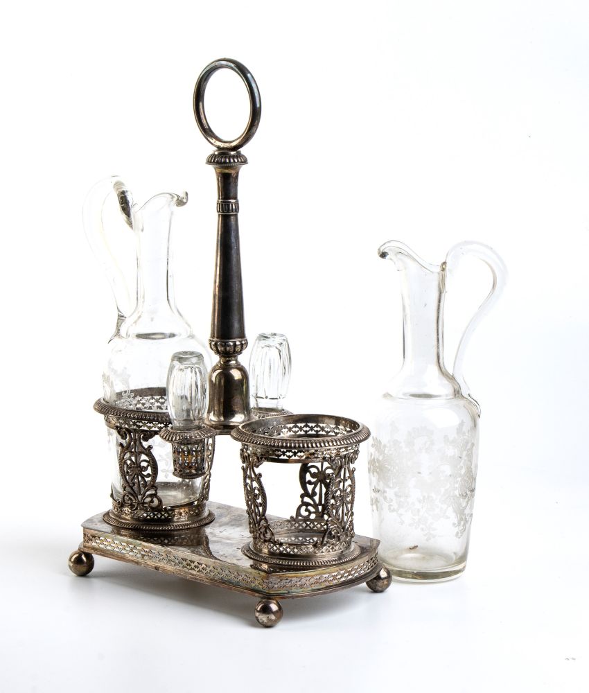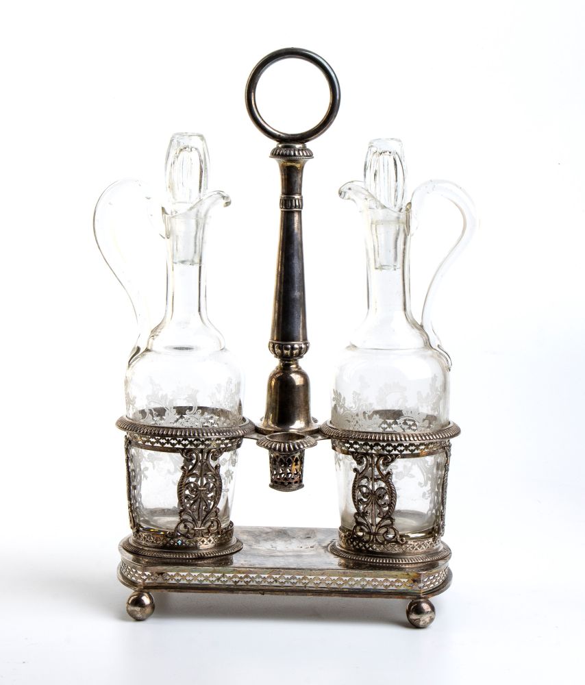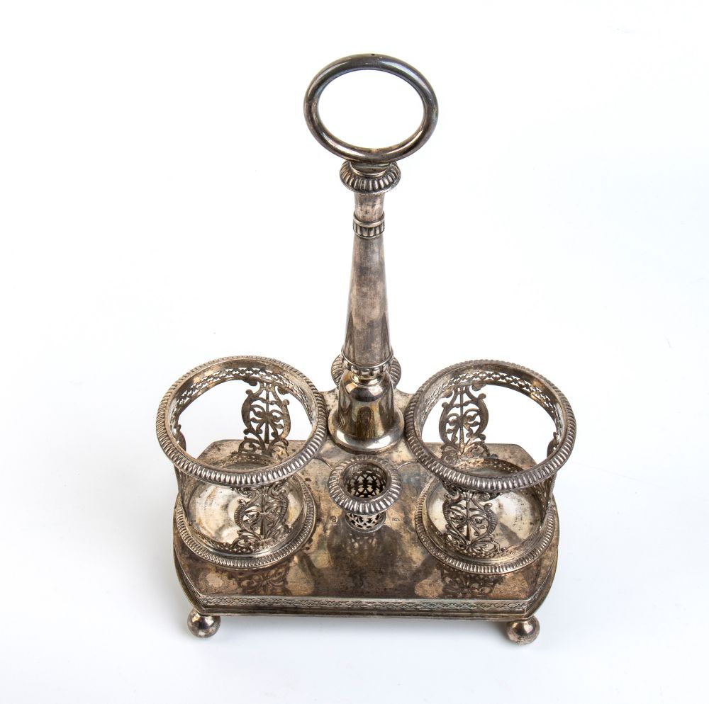 di forma sagomata traforata con decorazioni geometriche e fogliate, poggiante su quattro piedini a sferai; presa centrale con due ampolle laterali in vetro. Punzonata con marchi non identificati.