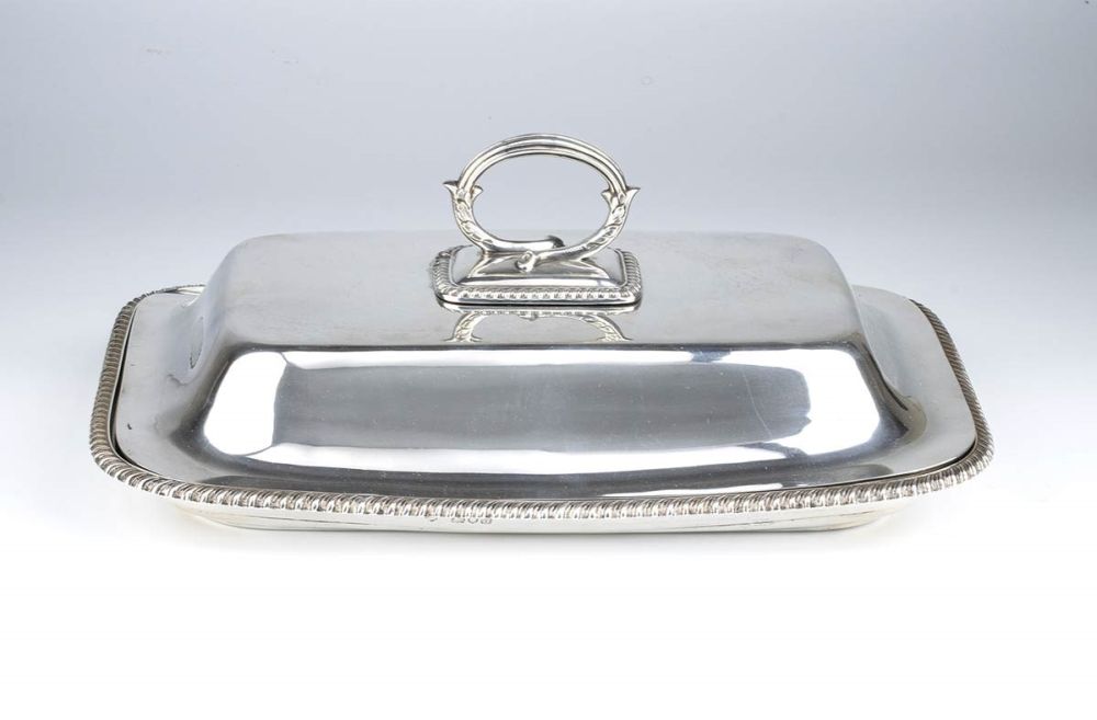 di forma rettangolare con bordo godronato. La vaschetta di scolo interna sopra il vassoio consente agli asparagi di rimanere consistenti e caldi con l'aggiunta di acqua calda nello scomparto più in basso. La legumiera può essere utilizzata anche senza il vassoio interno. Argento 925/1000, serie completa di marchi Londra 1896-1897, argentiere Maxfield & Sons.