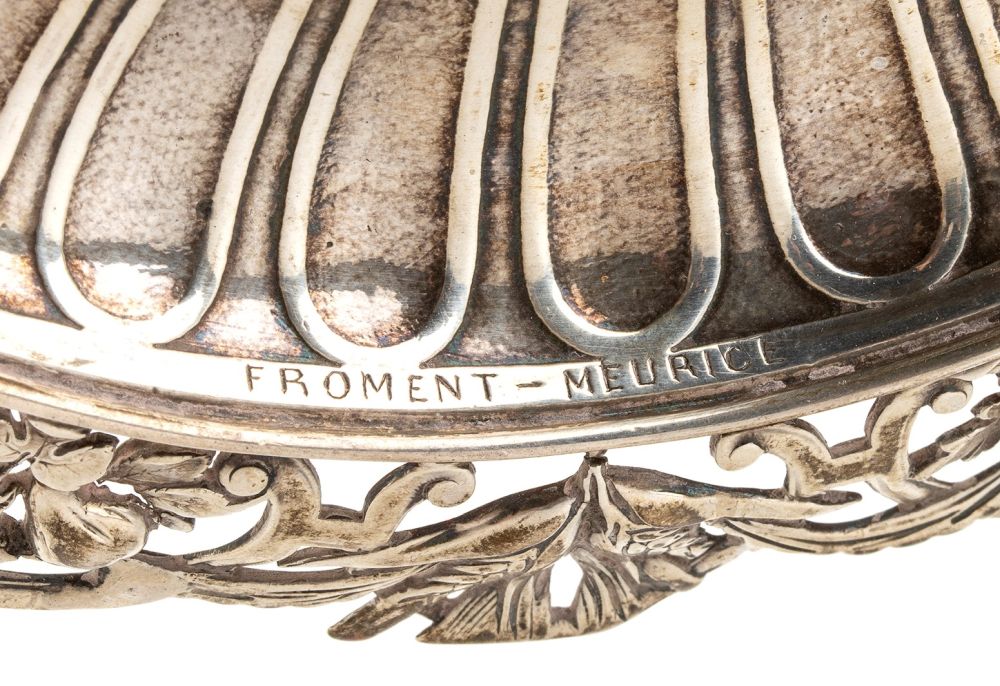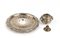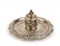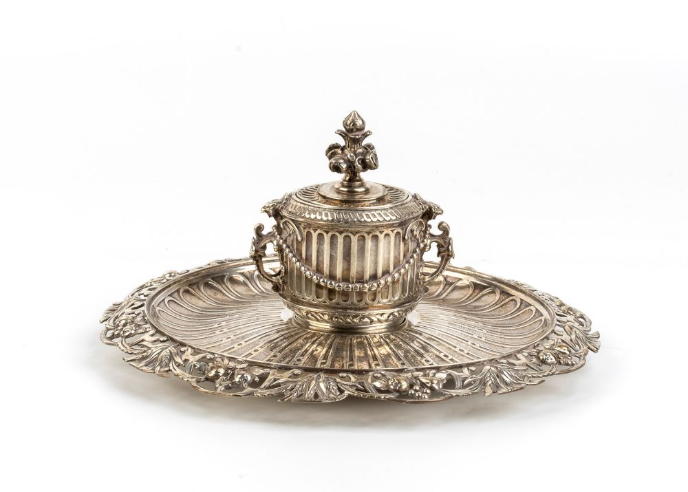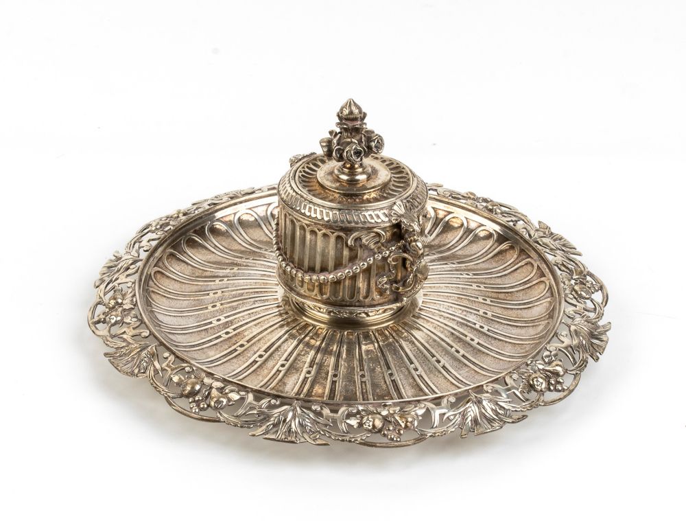 di forma circolare con costolature radiali e bordo a decori vegetali; il portainchiostro biansato, decorato similarmente al piatto, presenta un coperchio con cimatura floreale. Punzonato con marchi francesi post 1838 in uso a Parigi per l'argento 950/1000, marchio argentiere " J W e due stelle".
