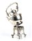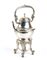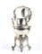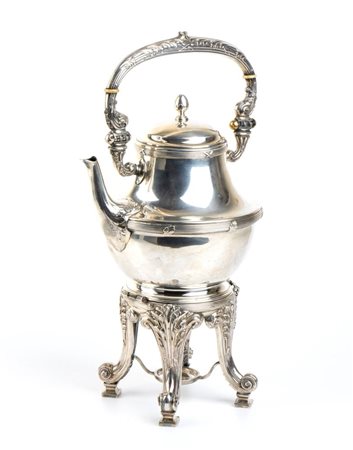 di forma circolare con corpo liscio, poggiante su tre piedini a riccio cimati da foglie d'acanto. Argento 800/1000, punzonato "800" e argentiere non identificato. Coperchio incernierato. manico pieghevole con distanziatori aterici in osso.