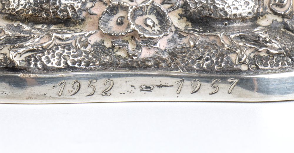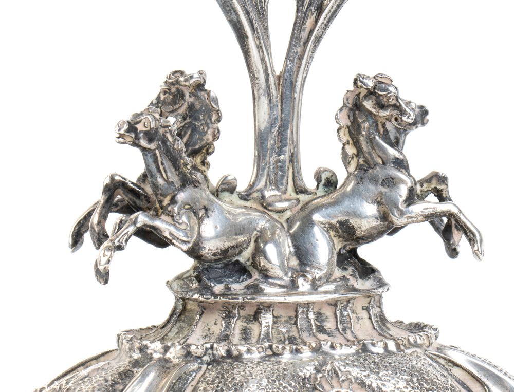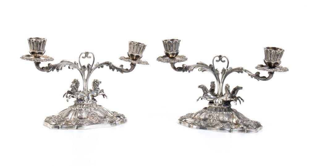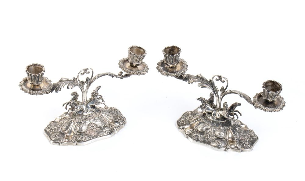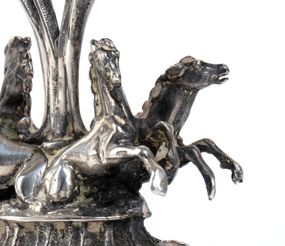 a due luci poggianti su base sagomata con decori floreali, fusto impreziosito da quattro cavalli. Argento 800/1000, punzonati "800 - 1 AR".