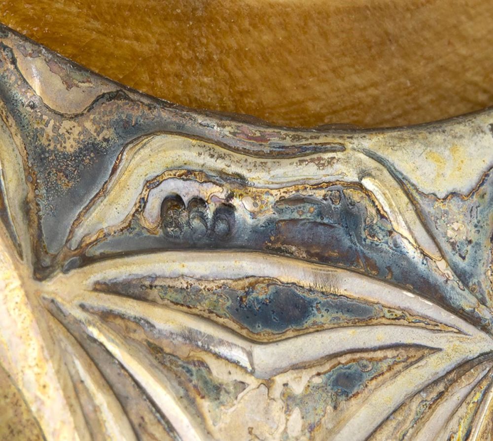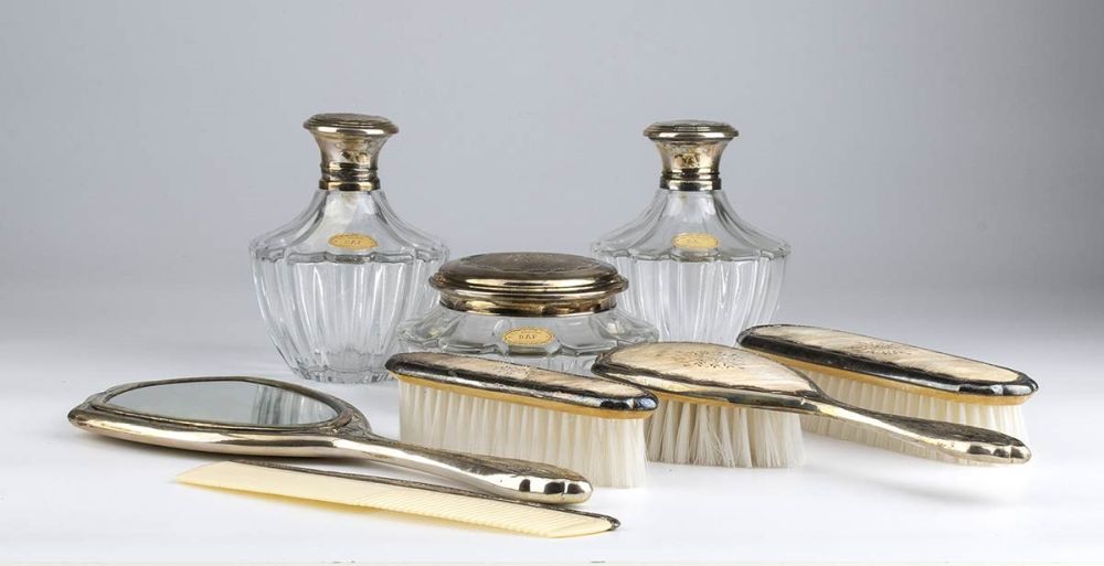 composto da tre spazzole, un pettine, uno specchio, due flaconi ed una scatola in vetro molato incisi con motivi floreali. Argento 800/1000, punzonati "800".