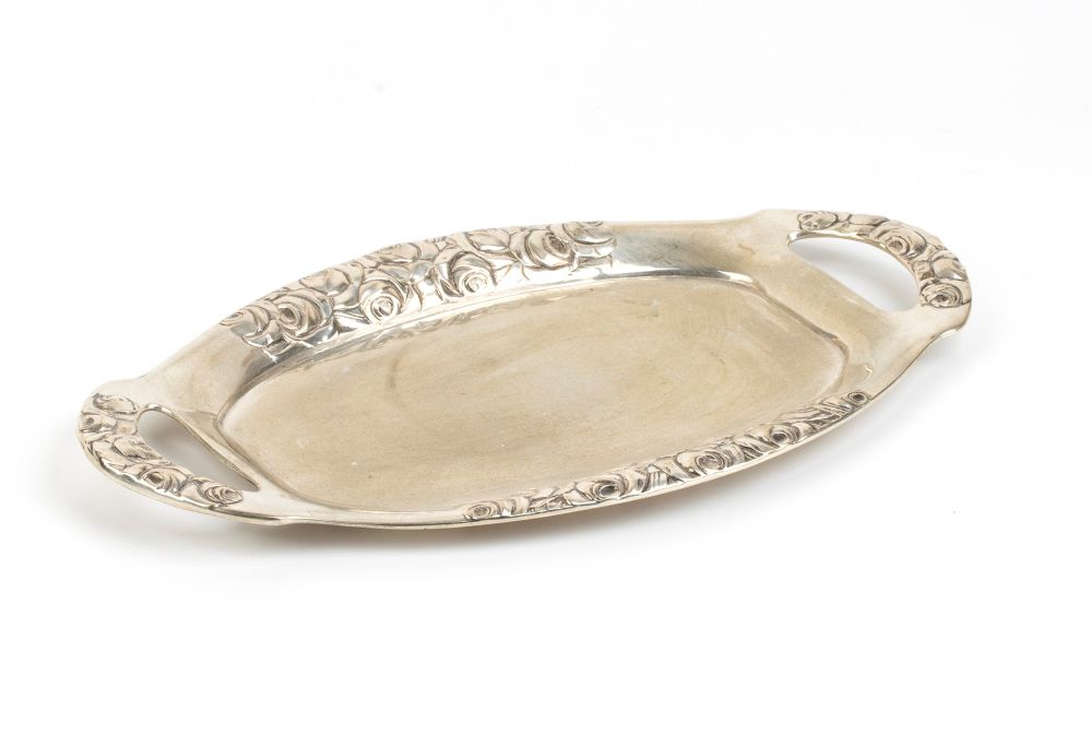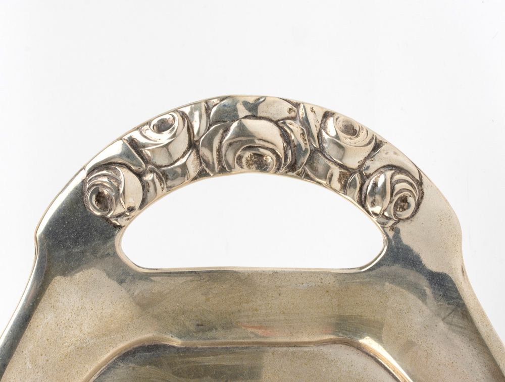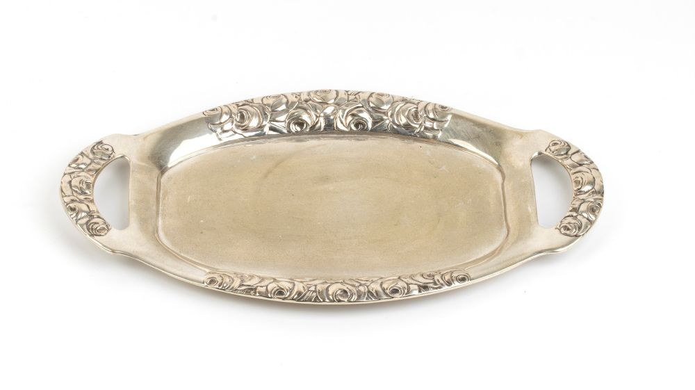 di forma sagomata con manici laterali, sbalzato e cesellato con motivi a rose. Argento 835/1000, punzonato con i marchi in uso in Germania dopo il 1888, argentieri Bruckmann & Söhne, Lerchenstraße.