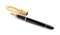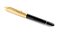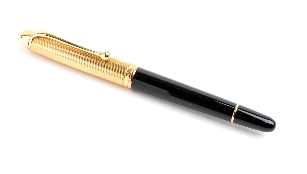 corpo in lacca nera con finiture dorate e cappuccio dorato con scanalature verticali, pennino in oro 14k riportante la dicitura "14K - 585 - logo Aurora e stella 5 TO". Sistema di caricamento a stantuffo. Punzonata "Aurora".