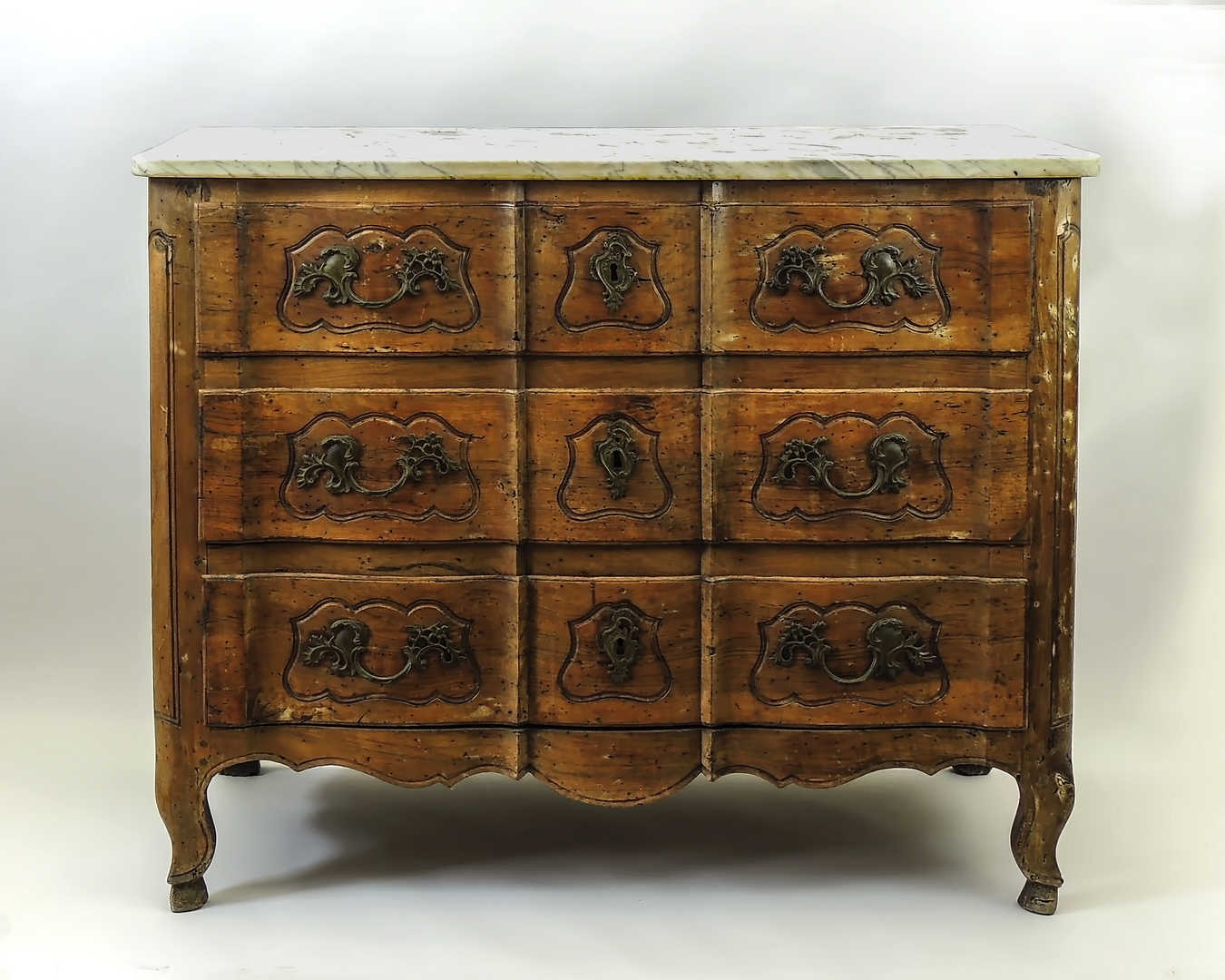 CASSETTONE IN NOCE - WALNUT CHEST OF DRAWERS piano in marmo bianco non pertinente, fronte leggermente mosso a tre cassetti con incise formelle lobatete, pendaglina sagomata, gambe mosse, piedini a zoccolo stilizzato, difetti h cm 100x120x60