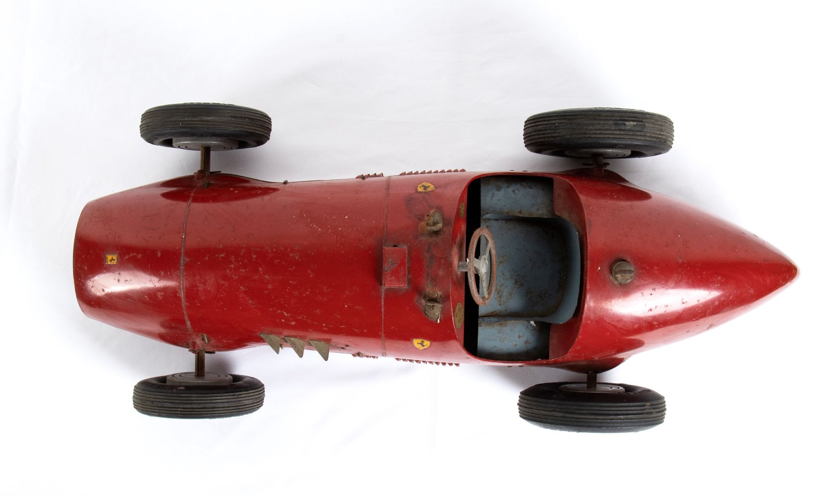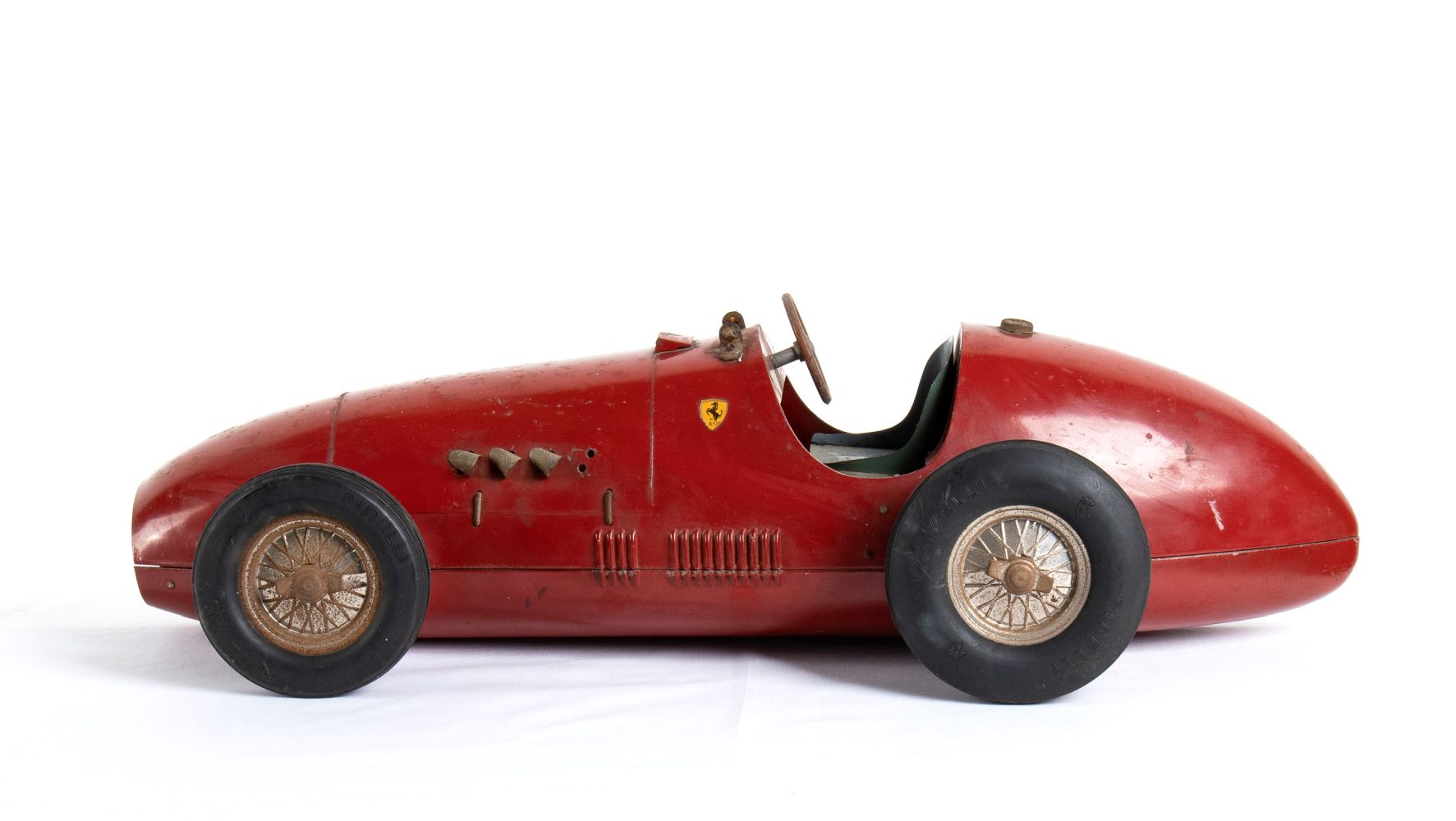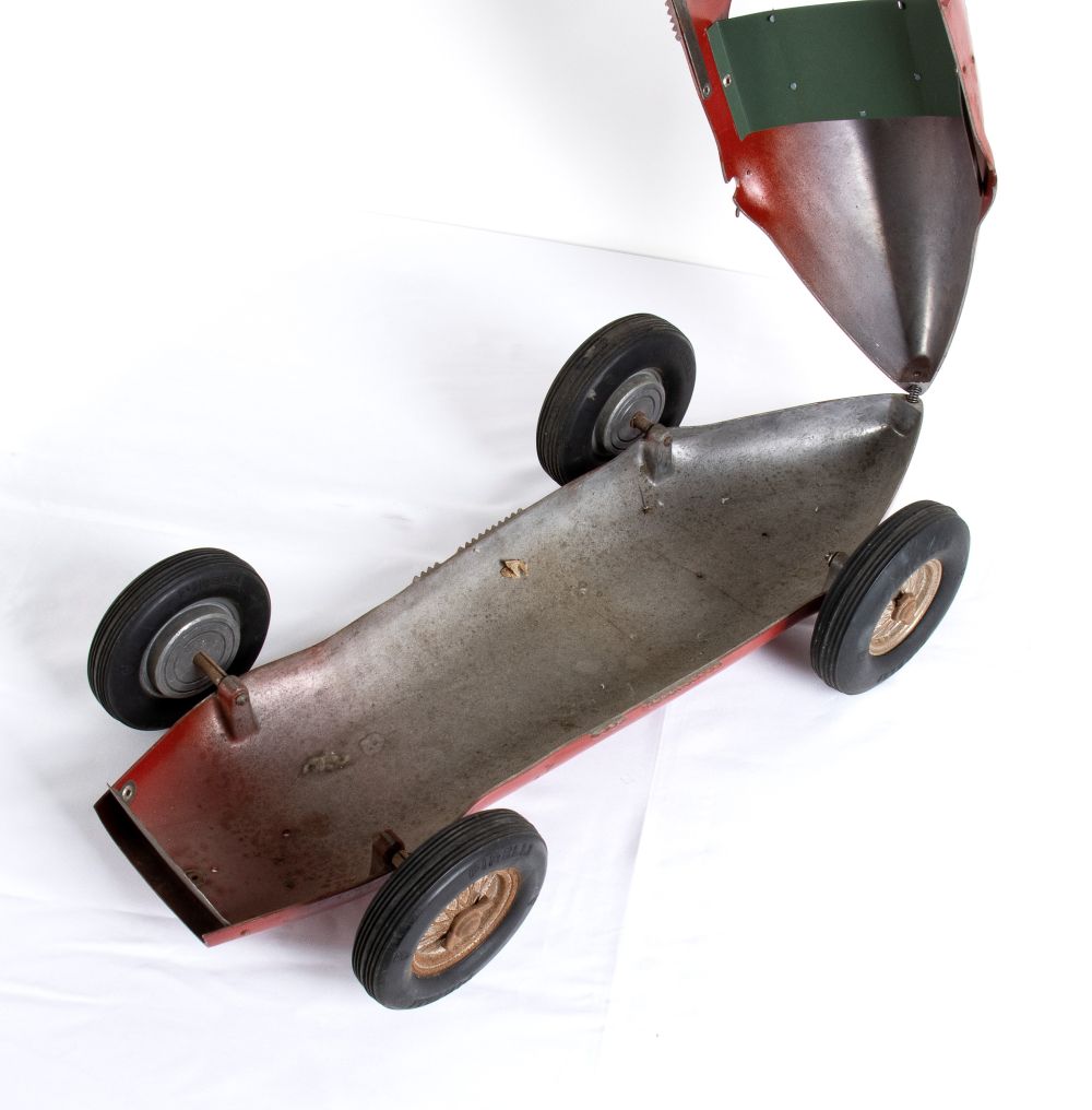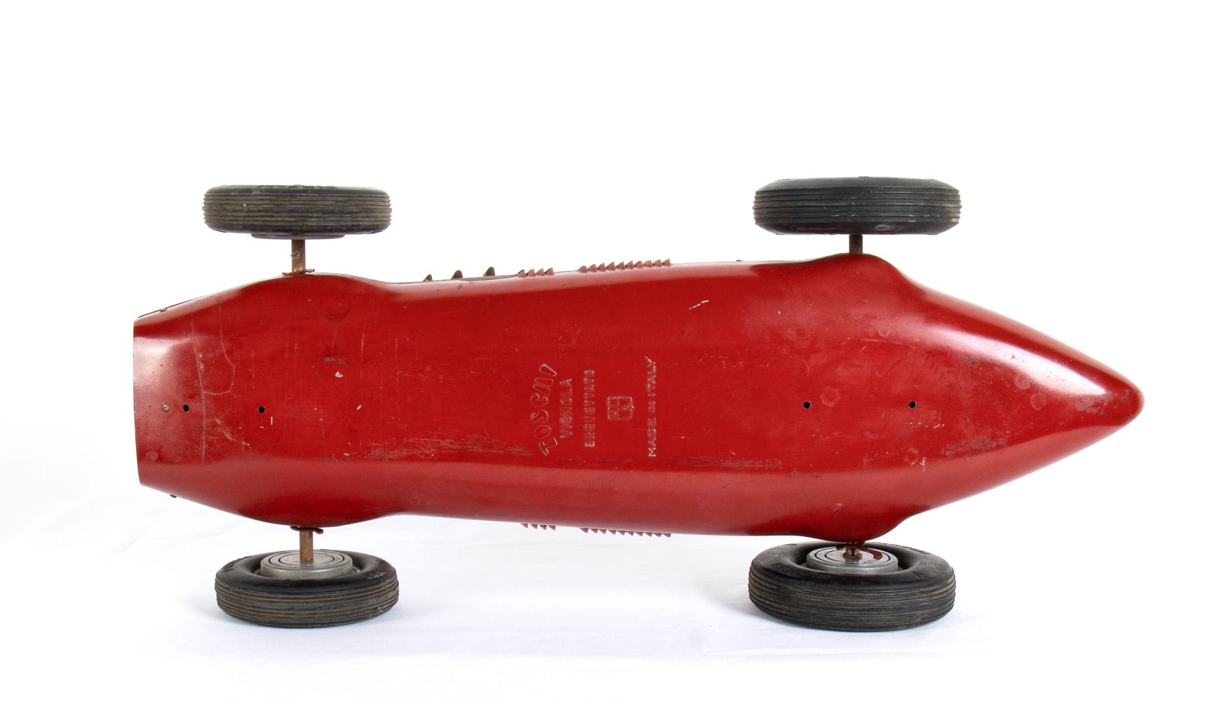 Latta cm.55 FERRARI 500 della Marchesini Luigi di Bologna (MLB) prodotta per le distillerie TOSCHI Vignola nel 1952. Marcata FONDERPRESS BOLOGNA all'interno della carrozzeria, sul fondo esterno Toschi Vignola Brevettato. Ruote con galletti di bloccaggio, pneumatici marcati PIRELLI. Completa di sterzo e di sedile di guida. Mancante di un tubicino di scappamento laterale, e del parabrezza in celluloide. Vernice originale, tracce di ossidazione sparse, decalcomanie Ferrari originali