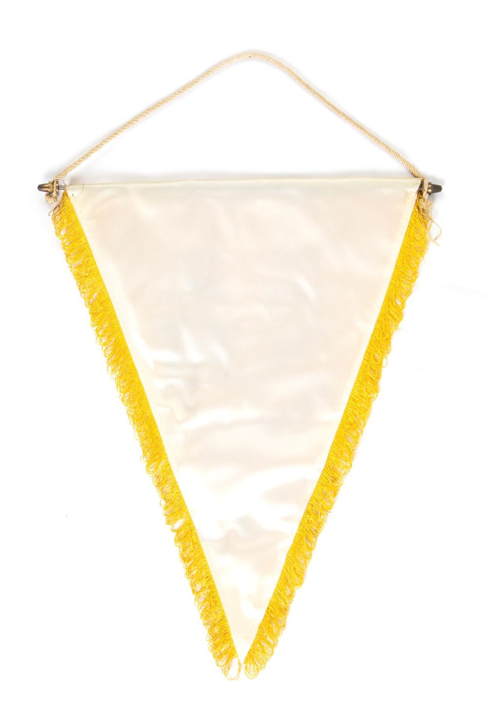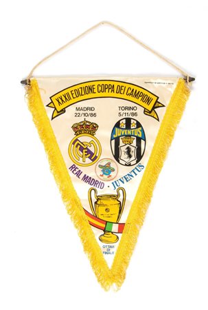 cm.37x27 Celebrativo della XXXII Edizione della Coppa dei Campioni, Ottavi di Finale, squadre Real Madrid - Juventus, per gli incontri del 22/10/1986 e 5/11/1986. Logo Sombrero Viaggi. In materiale sintetico, a stampa, frangia sintetica applicata, asta in metallo di supporto. Marcato COPYRIGHT OF JUVENTUS AI MA-TO
