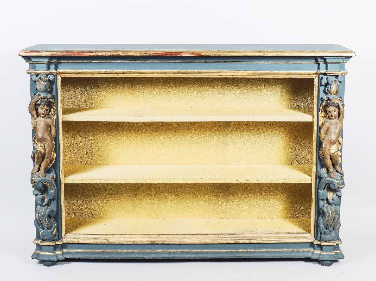 PICCOLA LIBRERIA IN LEGNO LACCATO COLOR PAVONE E IN PARTE DORATO - SMALL LACQUERED AND GILTWOOD BOOKCASE lesene intagliate con putti e girali, scaffali a giorno h cm 87x125x29