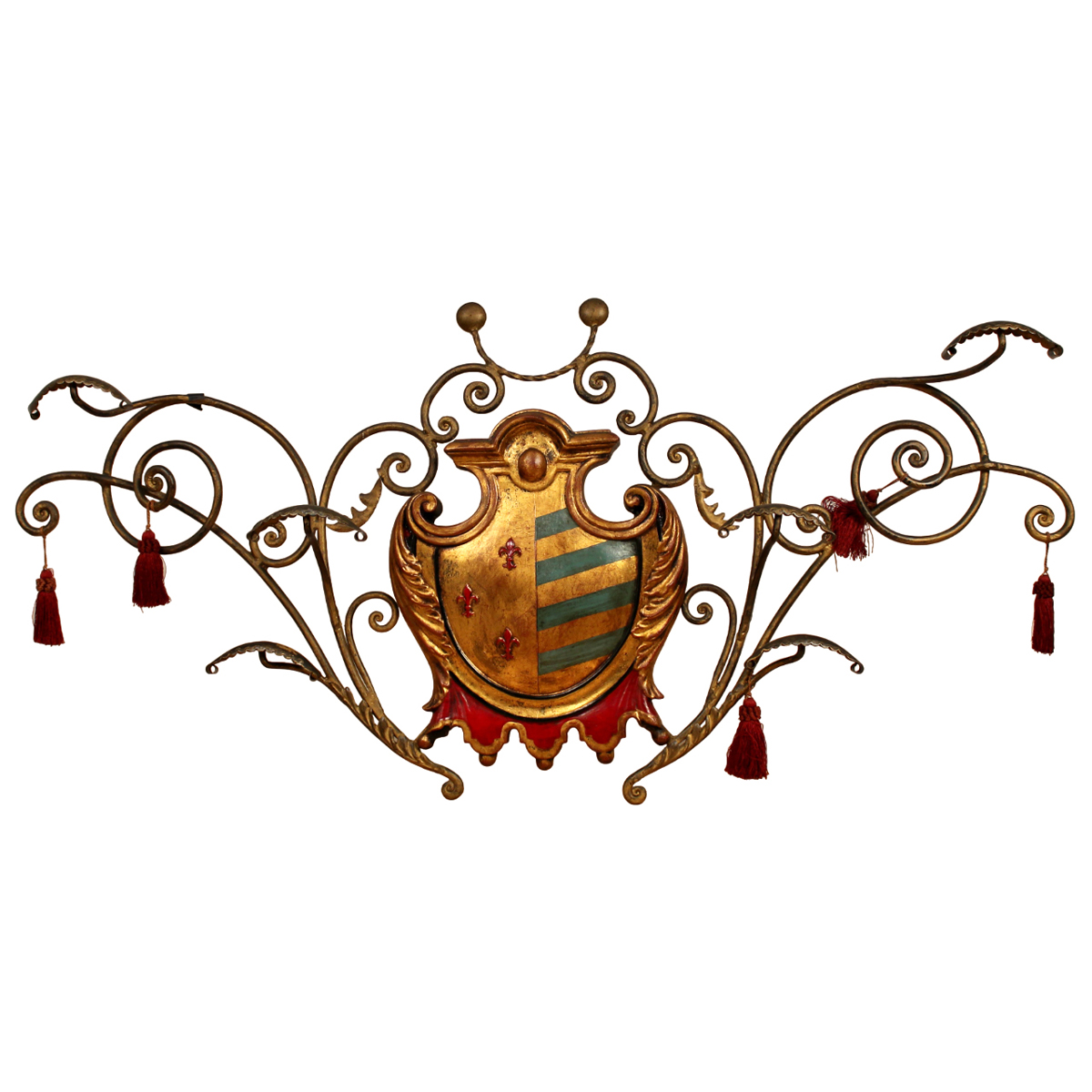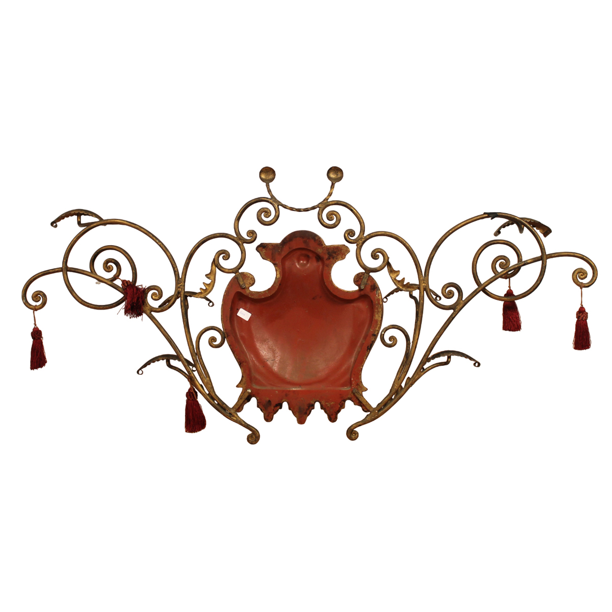 Ferro battuto e dorato con stemma gentilizio in legno scolpito, dorato e laccato su fondo rosso. Secolo XX. Cm 125x57
