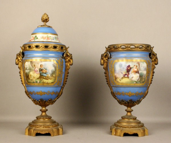 Firmato, datato. Coppia di vasi in porcellana con bronzi cesellati e dorati, decorato con scene galanti. Manifattura Foecy. XIX secolo. Un vaso mancante di coperchio. Mis. Lung. cm. 17 Alt. cm. 36 ca.