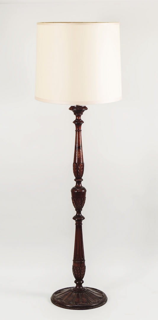 PIANTANA IN NOCE - WALNUT WALL LAMP stelo tornito e intagliato con palmette, completa di paralume h cm 172
