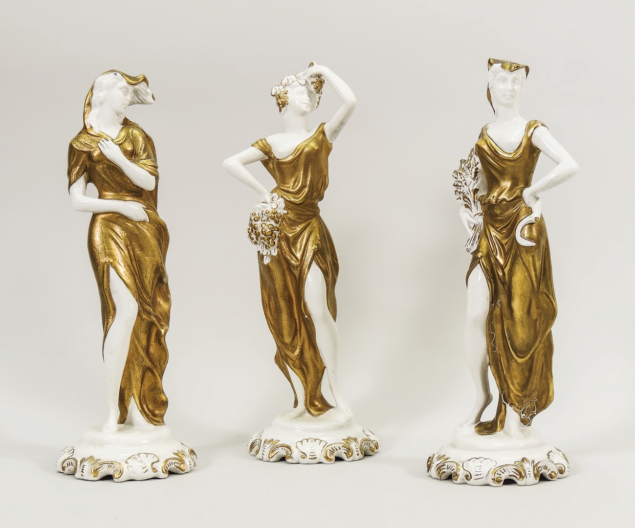 SERIE DI TRE FIGURE FEMMINILI IN CERAMICA - THREE CERAMIC FEMALE FIGURES Zaccagnini, Firenze raffiguranti allegoria dell'Estate, dell'Autunno e dell'Inverno, lumeggiate in oro (3) h cm 32 circa