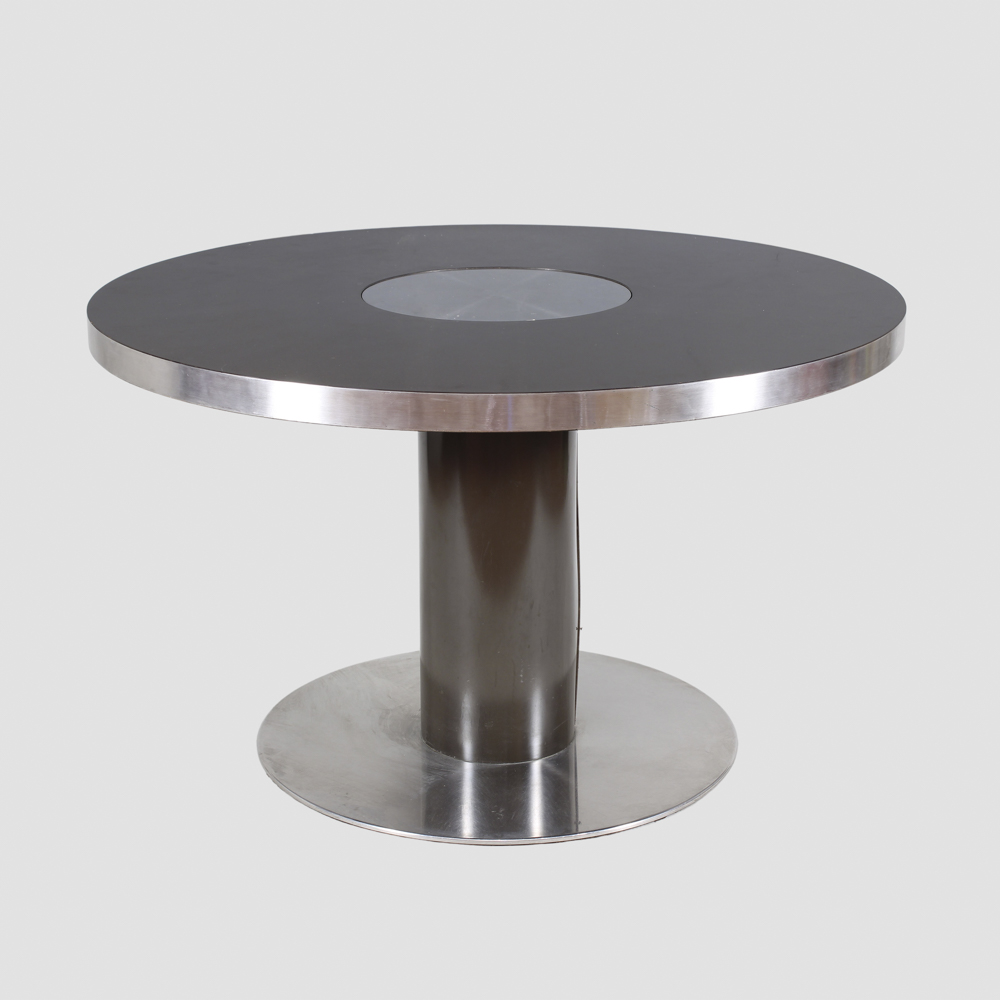 tavolo circolare mod. TP UNOPIEDI con tre sedie in acciaio, metallo laccato e laminato, firmato, usure