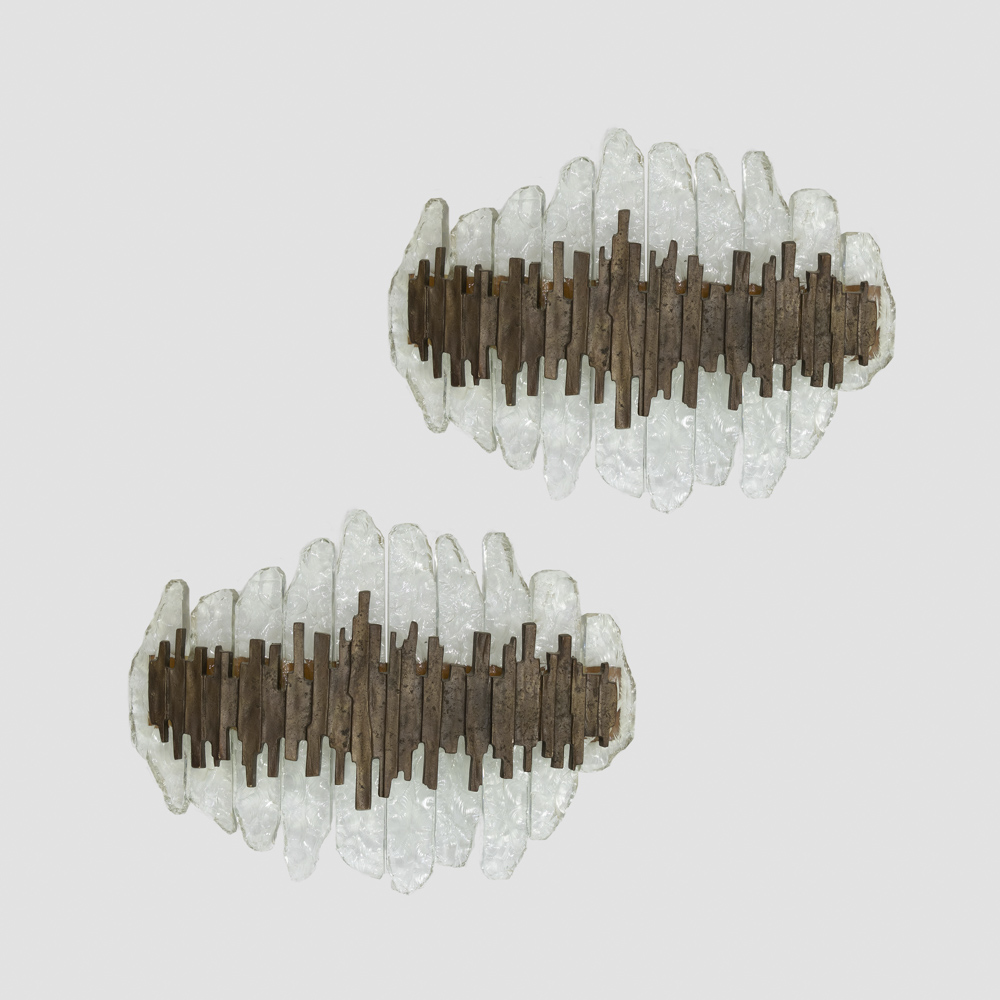 coppia di lampade da parete mod. 2496 in metallo laccato, bronzo e vetro scalpellato